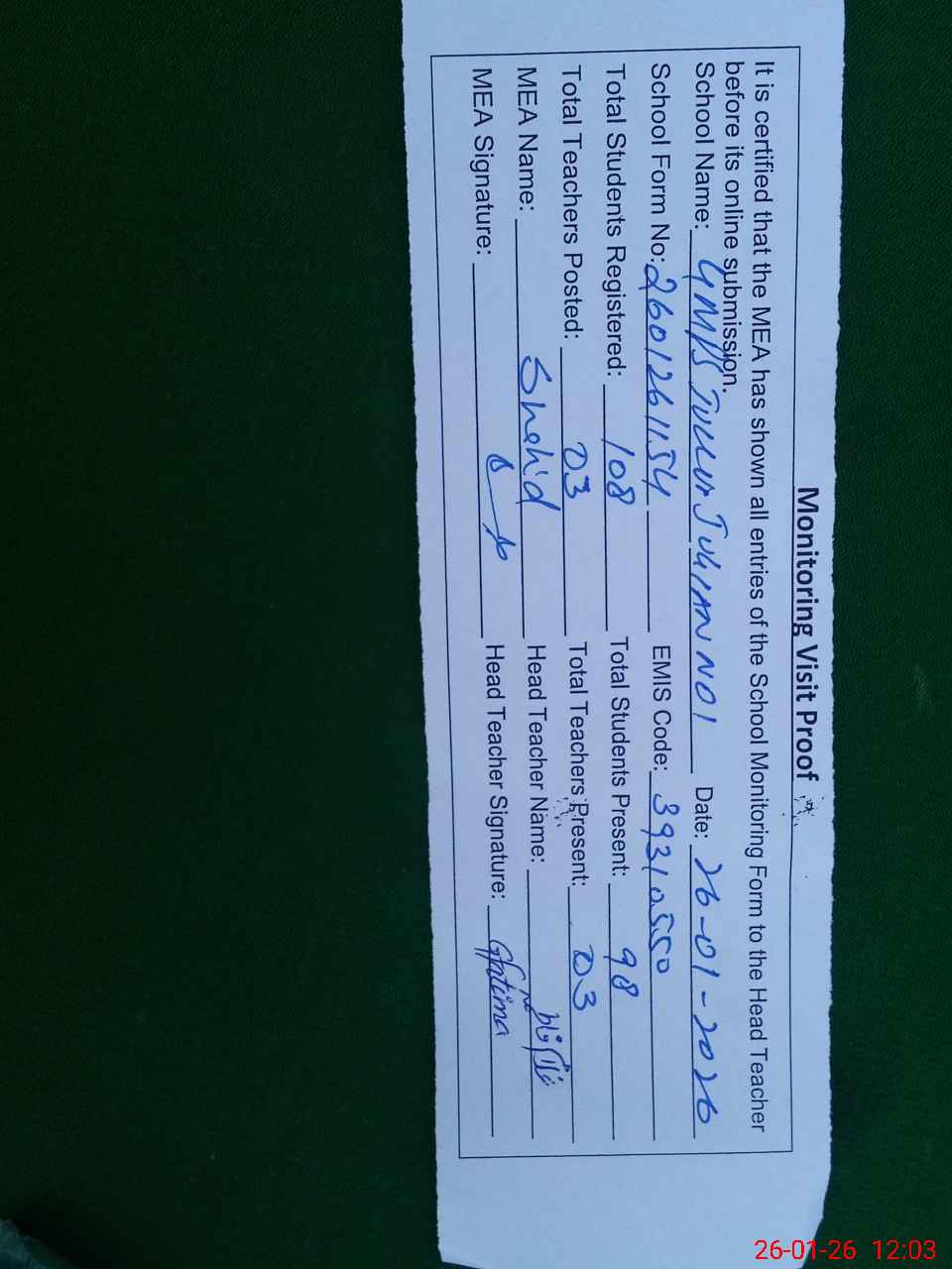 | Attendance Register | Head Teacher | MEA with School | Visit Proof |