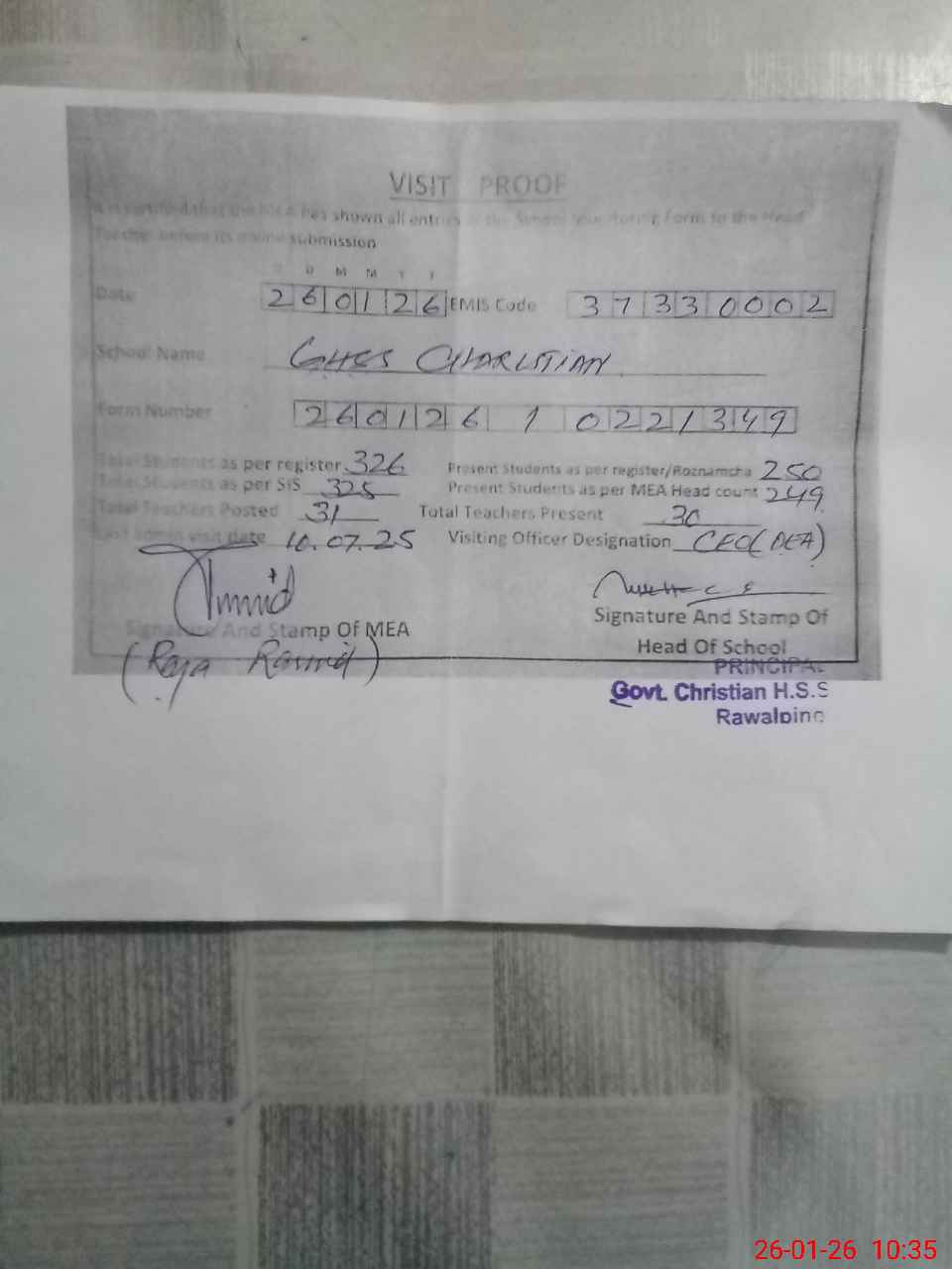 | Attendance Register | Head Teacher | MEA with School | Visit Proof |
