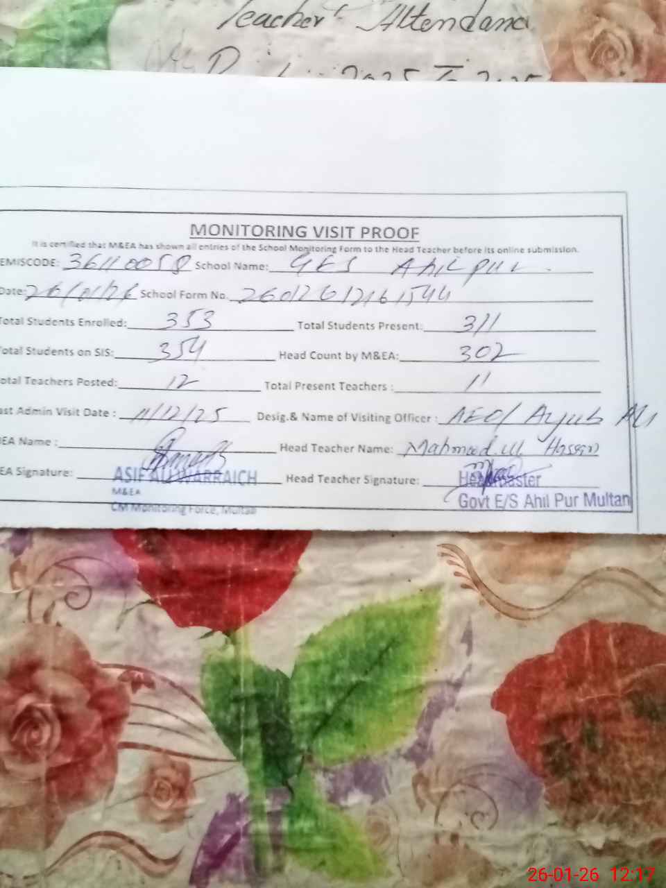 | EMIS Code: 36110058 | Name of School: GES AHIL PUR BASTI GHULAM YASEEN | |||