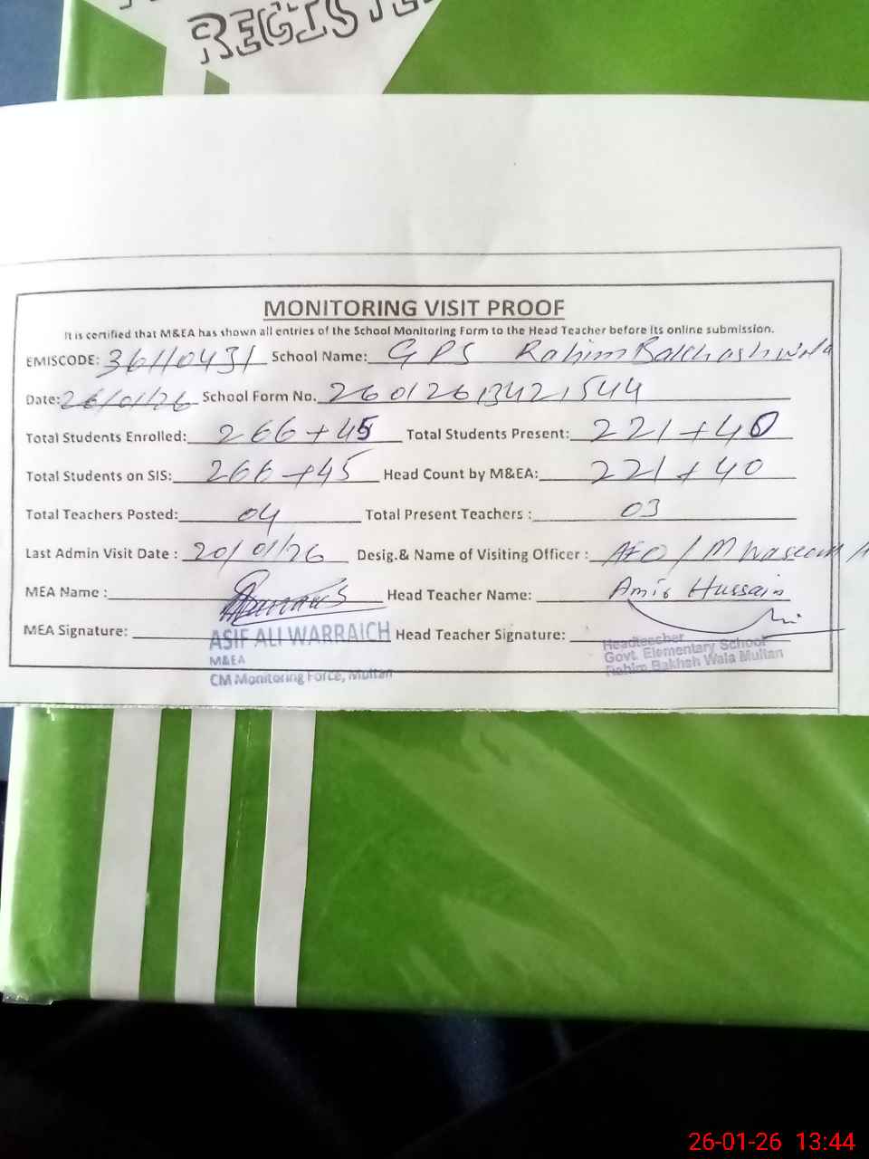 | EMIS Code: 36110431 | Name of School: GPS RAHIM BUKHSH WALA, BASTI BUTAY WALA (ALI AWAN WALA) | |||