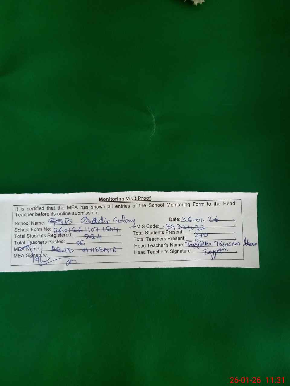 | Attendance Register | Head Teacher | MEA with School | Visit Proof |
