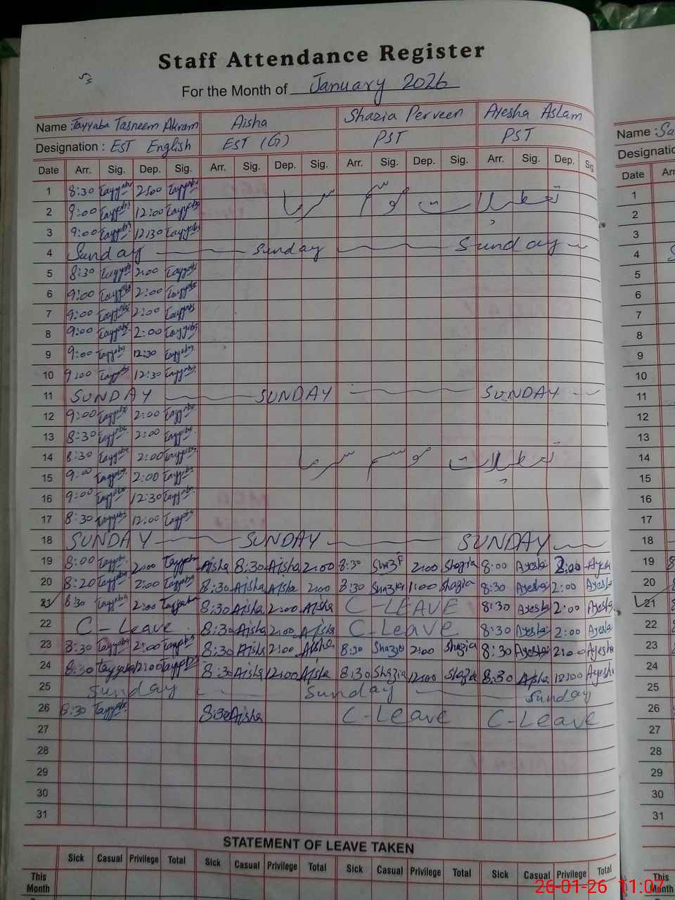 | Leave | Duty | Absent | Maternity | Medical | Ex- Pak |