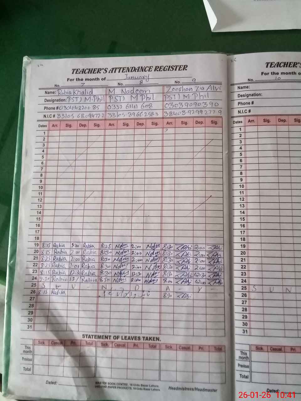 | CNIC | Full Name | Designation | R/C | Absence During Last Calender Month |