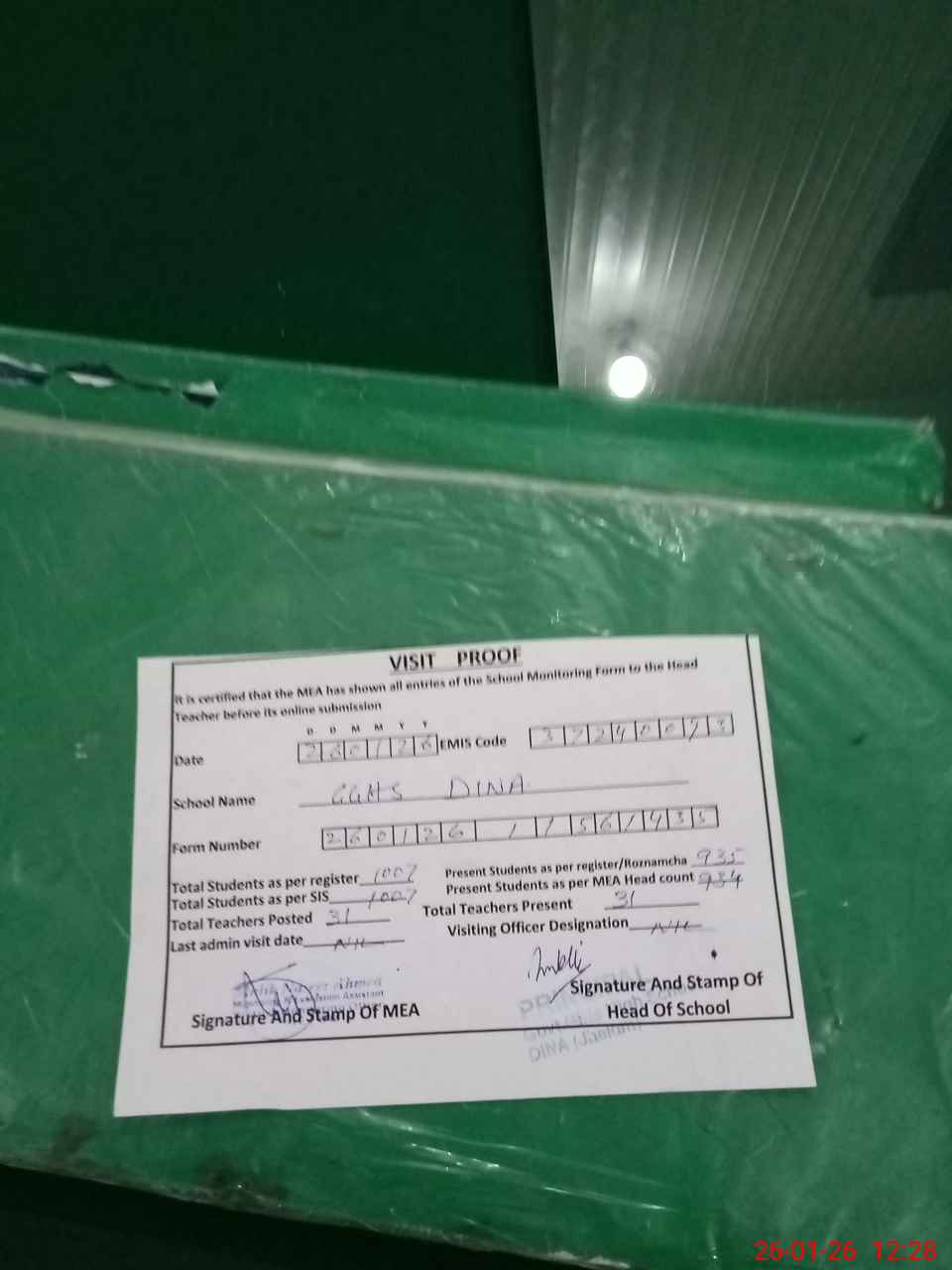 | Attendance Register | Head Teacher | MEA with School | Visit Proof |