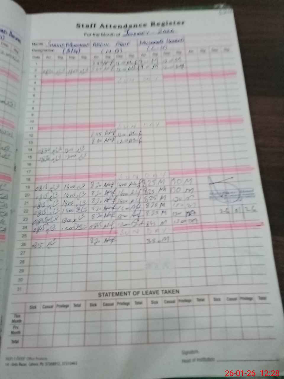 | CNIC | Full Name | Designation | R/C | Absence During Last Calender Month |