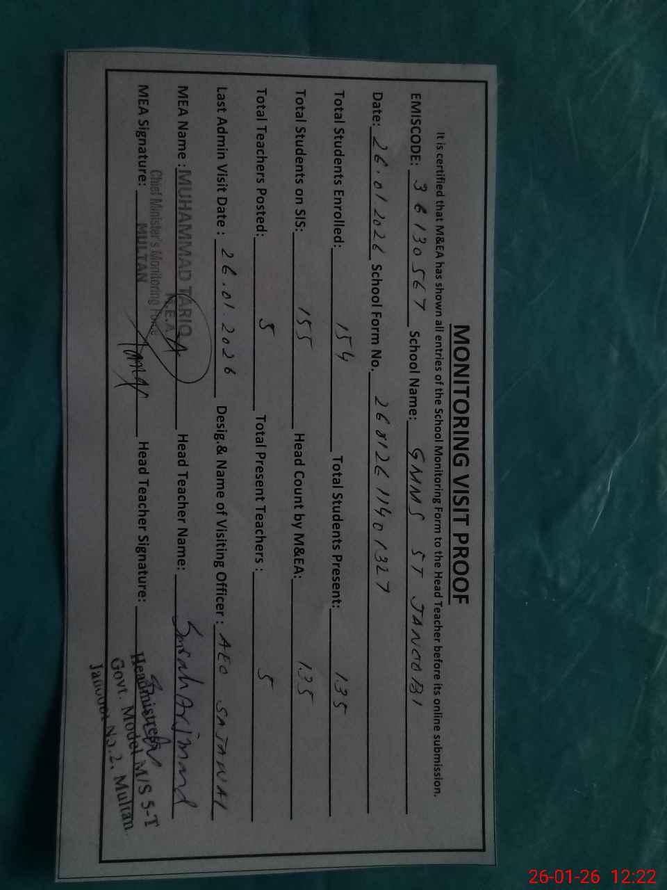 | EMIS Code: 36130567 | Name of School: Govt. Model Middle School 5-T NO.2 JANOOBI | |||