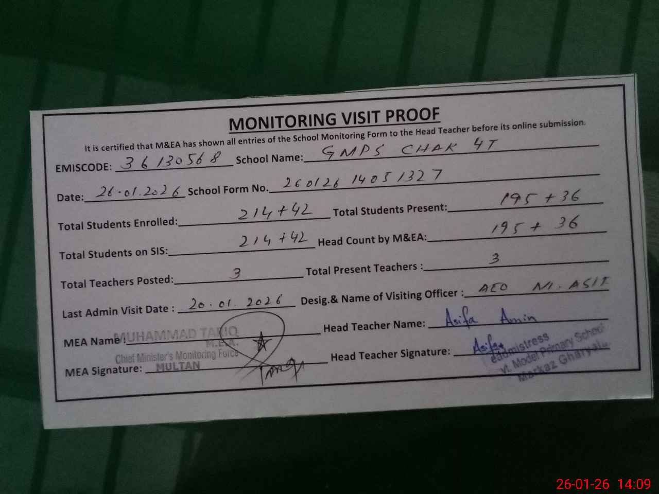 | EMIS Code: 36130568 | Name of School: GMPS CHAK 4-T P/O NO.1 MR | |||
