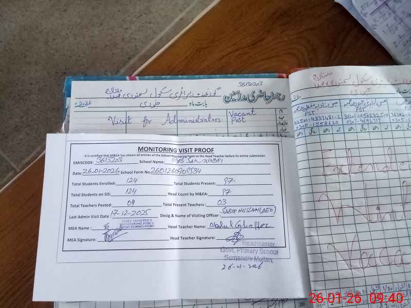 | Total no. of Classrooms: 4 No. of Classrooms Used for Teaching: 4 No. of Classrooms Storing Old Furniture, FTBs, etc: 0Comments if Any: PST SAJJAD HUSSAIN LEAVE MARKED WITHOUT ANY PROOF |