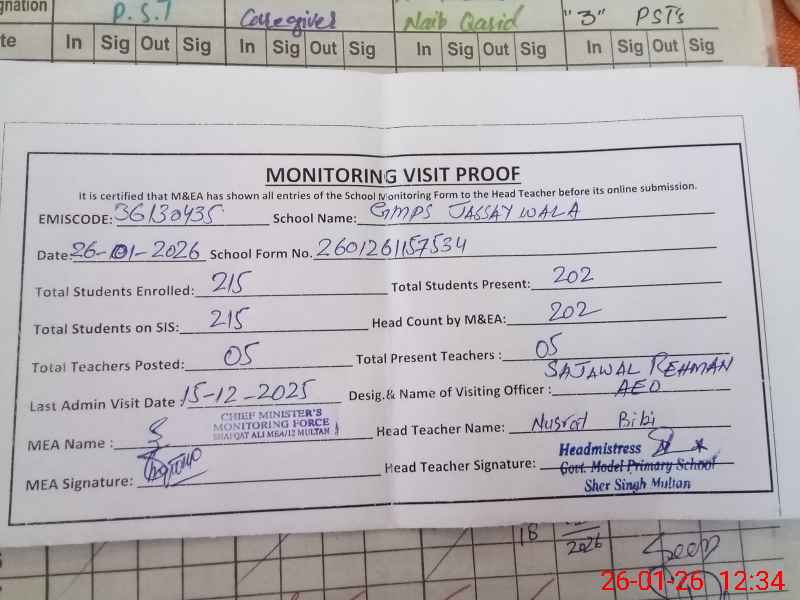 | EMIS Code: 36130435 | Name of School: GMPS JASSAY WALA MULTAN | |||