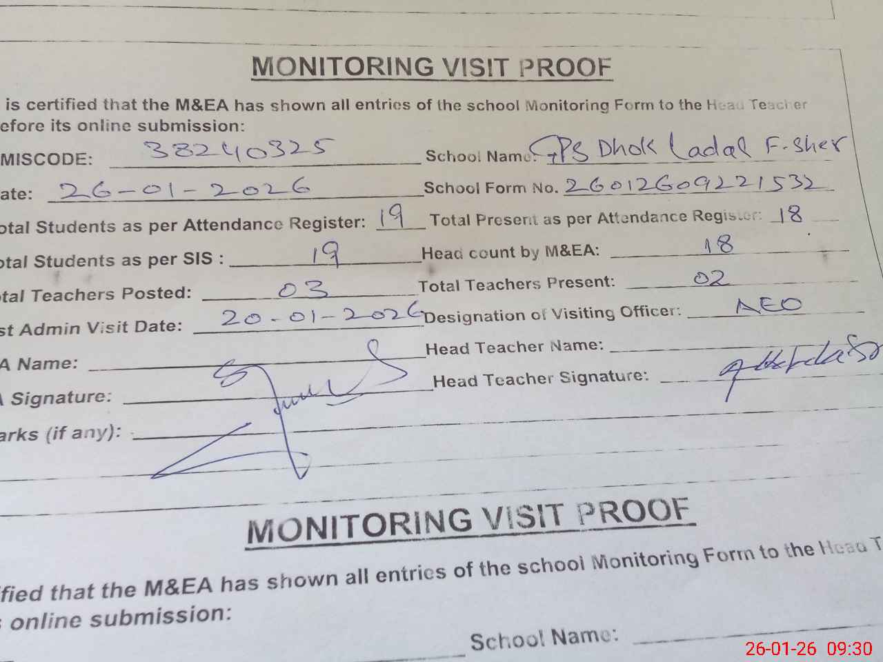 | Remarks (Use Separate Page if Required): Students on SIS Qty 19 Last admin visit On 20 January 2026 by AEO | |||||