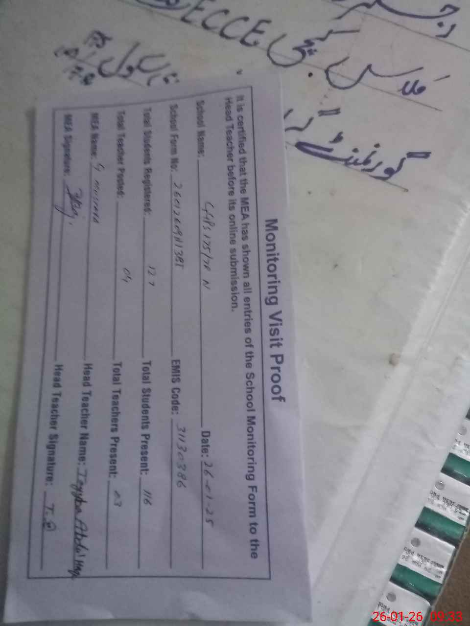 | Attendance Register | Head Teacher | MEA with School | Visit Proof |
