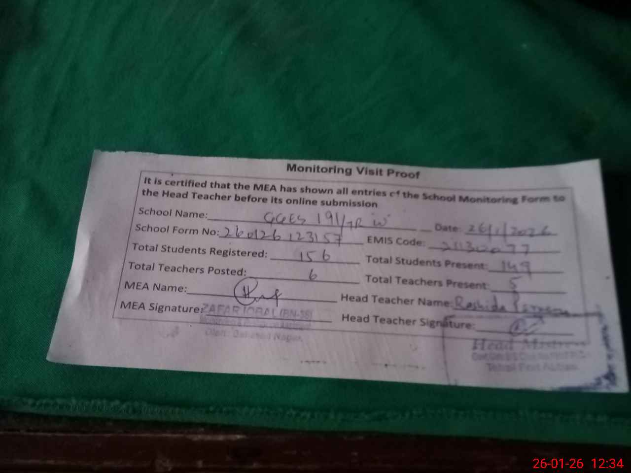 | Attendance Register | Head Teacher | MEA with School | Visit Proof |