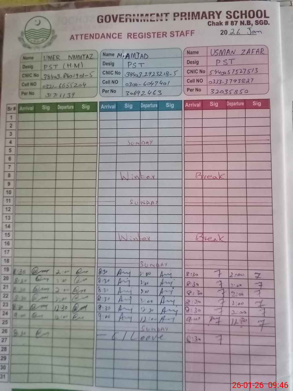 | CNIC | Full Name | Designation | R/C | Absence during last cal. month |