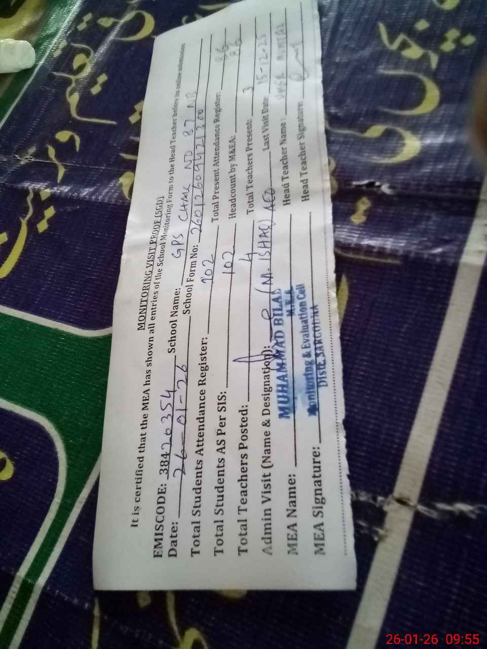 | Attendance Register | Head Teacher | MEA with School | Visit Proof |