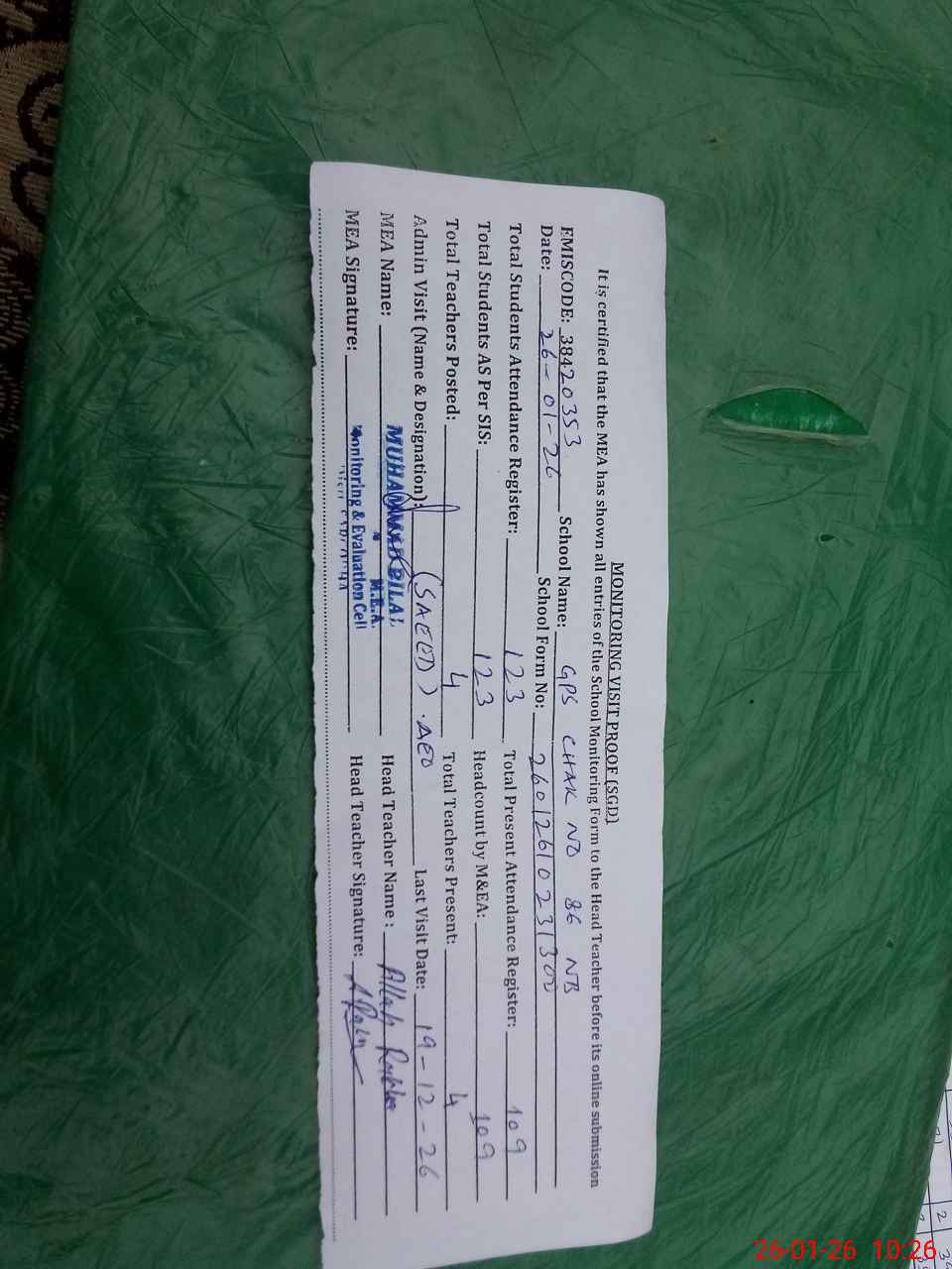| Attendance Register | Head Teacher | MEA with School | Visit Proof |