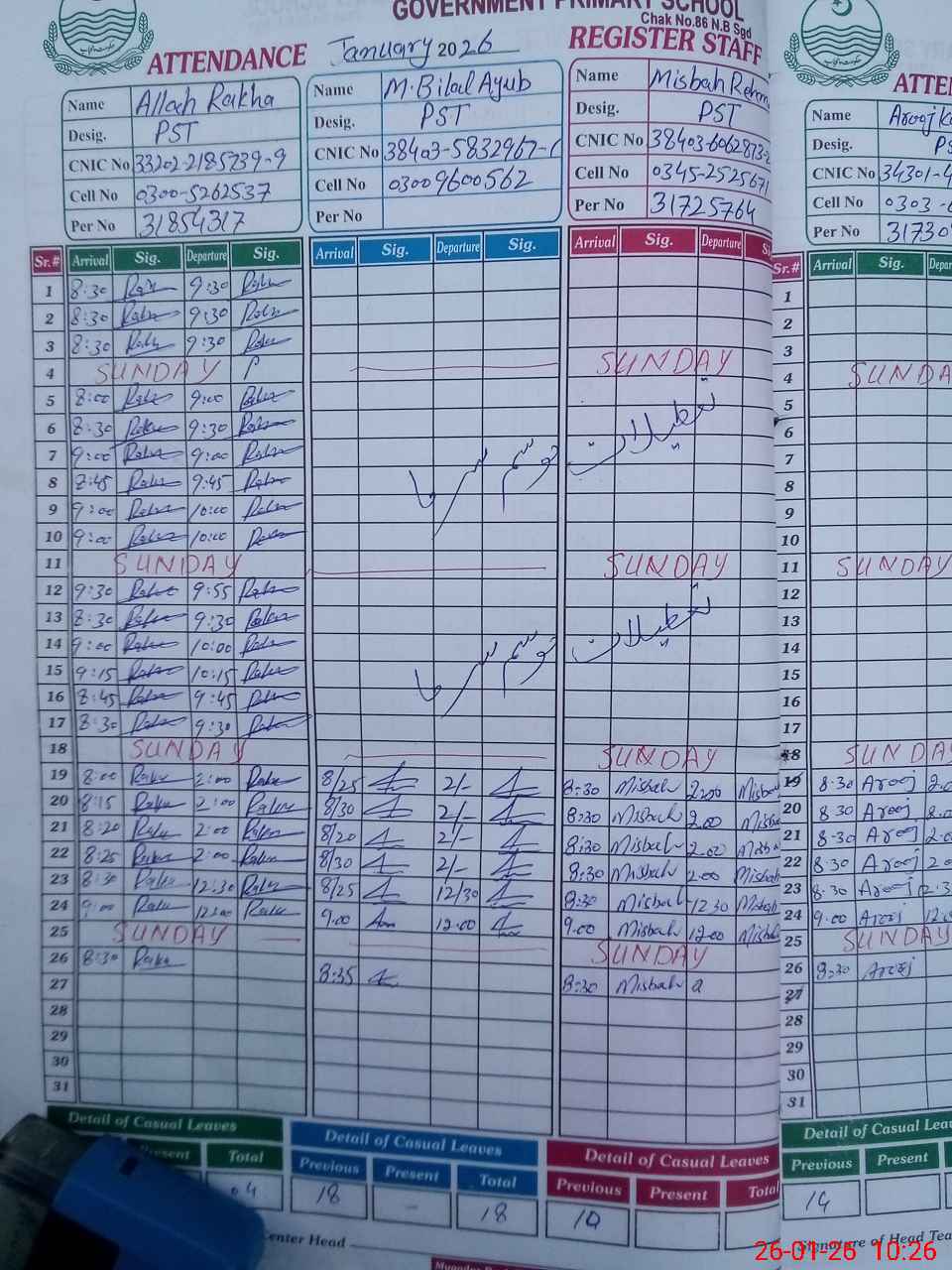 | CNIC | Full Name | Designation | R/C | Absence during last cal. month |