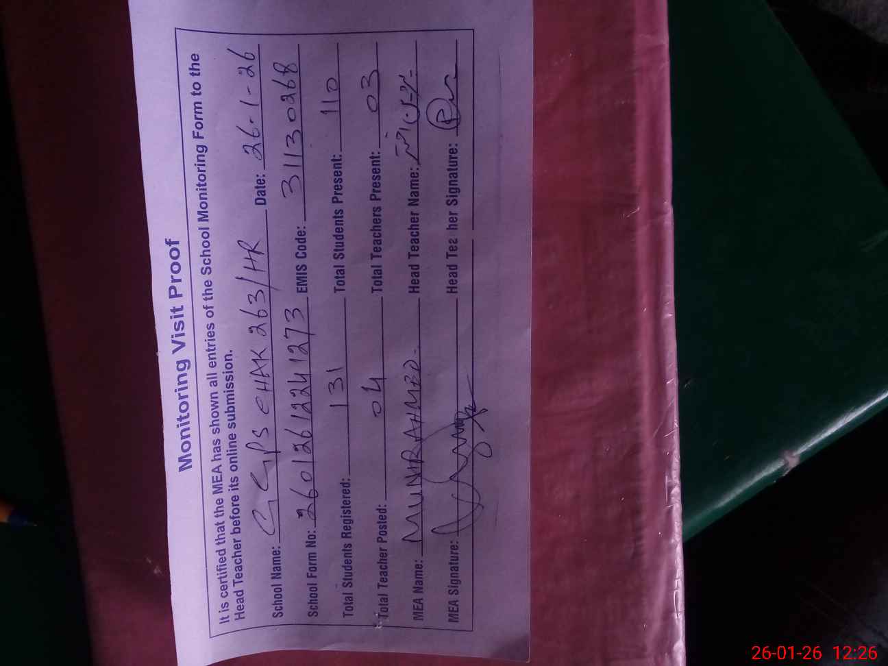 | Attendance Register | Head Teacher | MEA with School | Visit Proof |