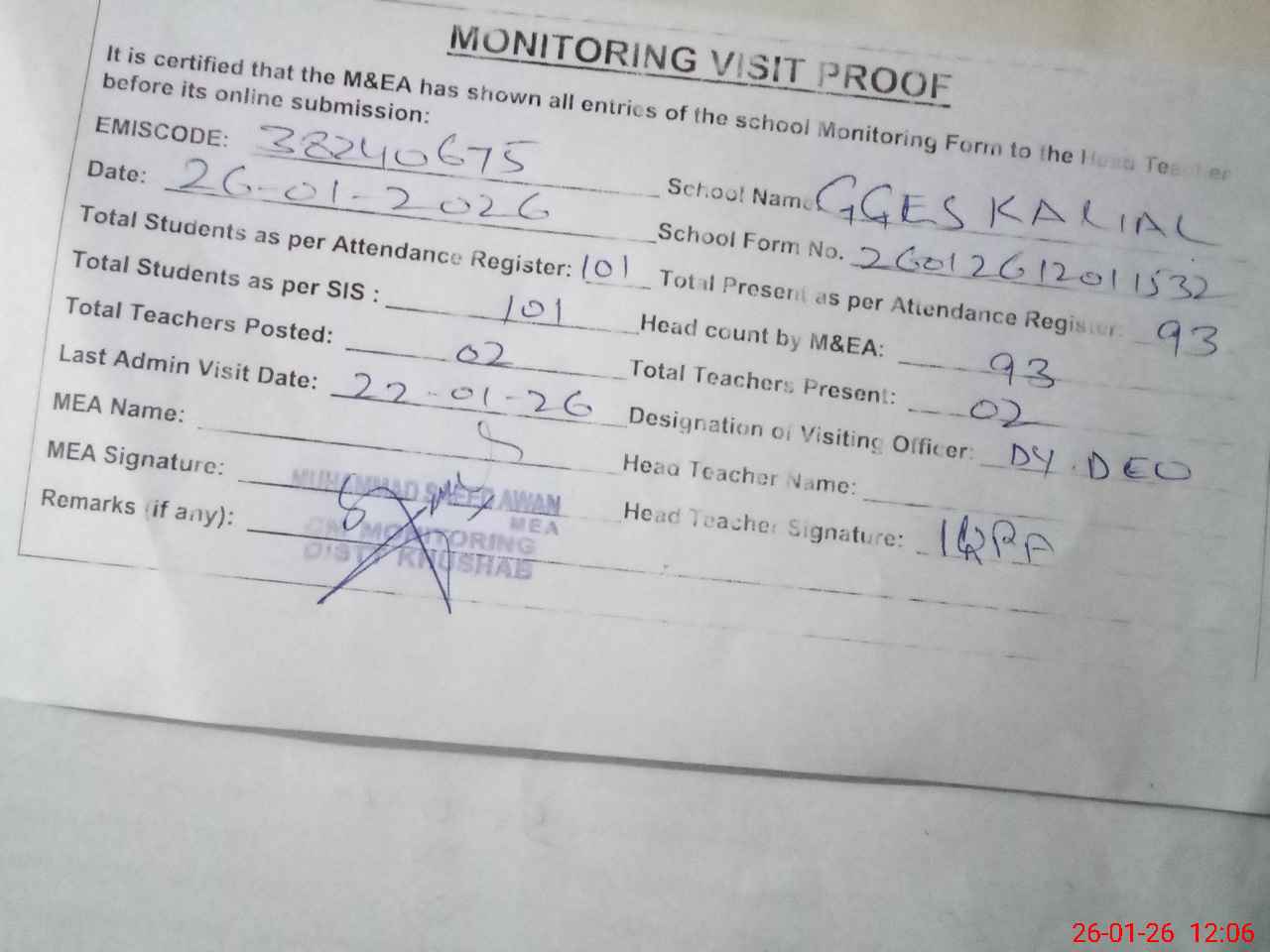 | Remarks (Use Separate Page if Required): Students on SIS Qty 101 Last admin visit On 22 January 2026 by Dy.DEO | |||||