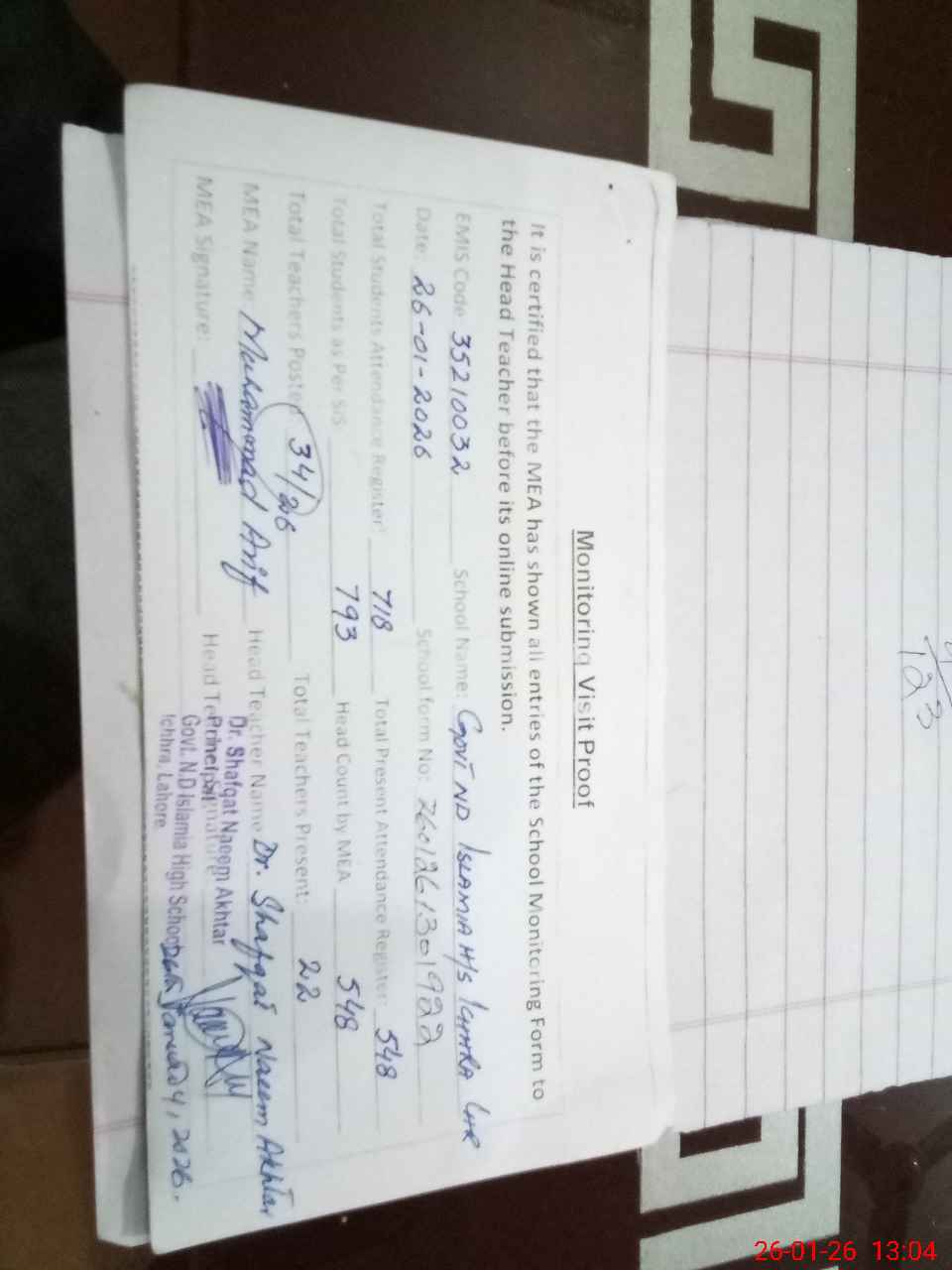 | Attendance Register | Head Teacher | MEA with School | Visit Proof |