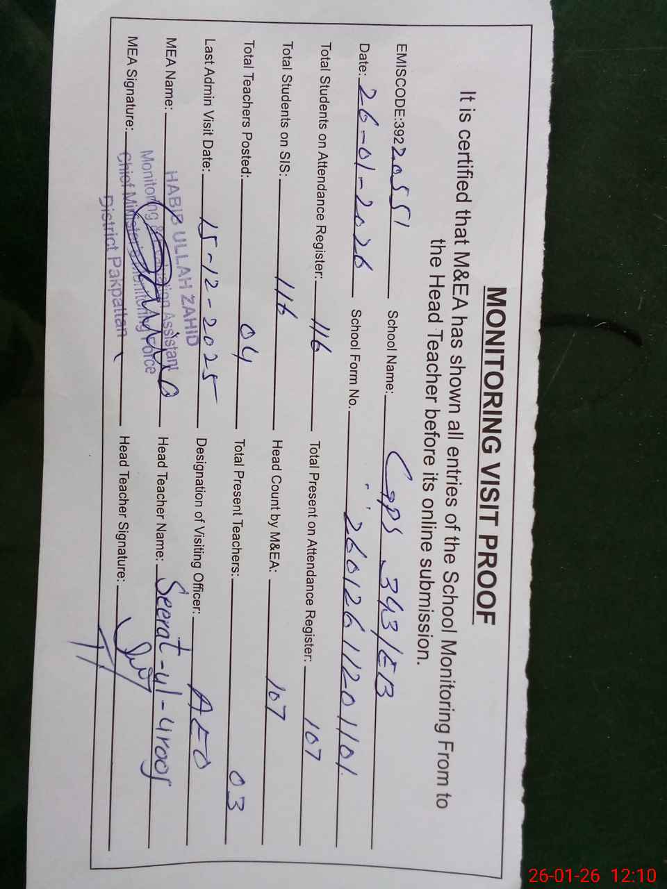 | Attendance Register | Head Teacher | MEA with School | Visit Proof |