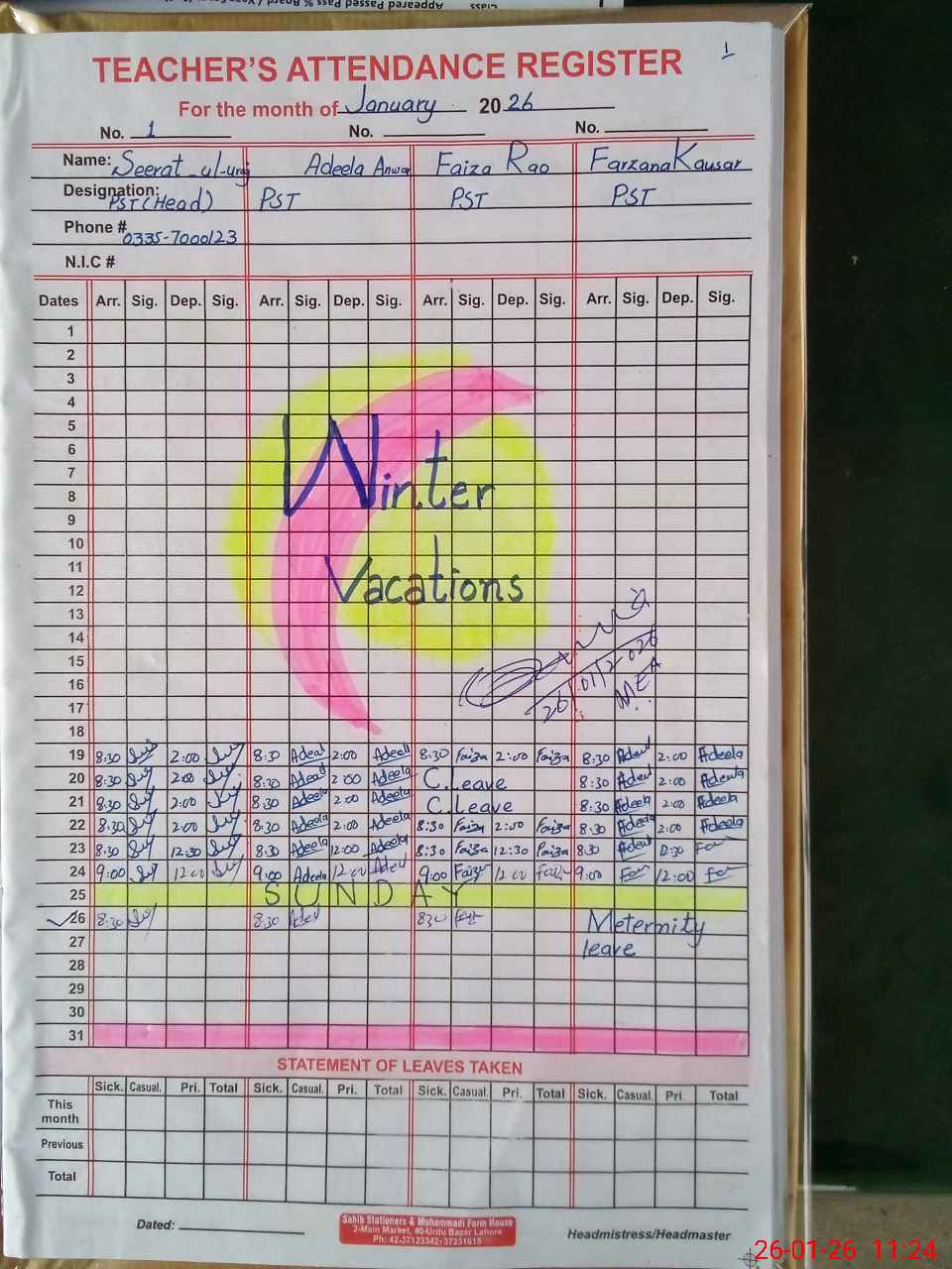 | Leave | Duty | Absent | Maternity | Medical | Ex- Pak |