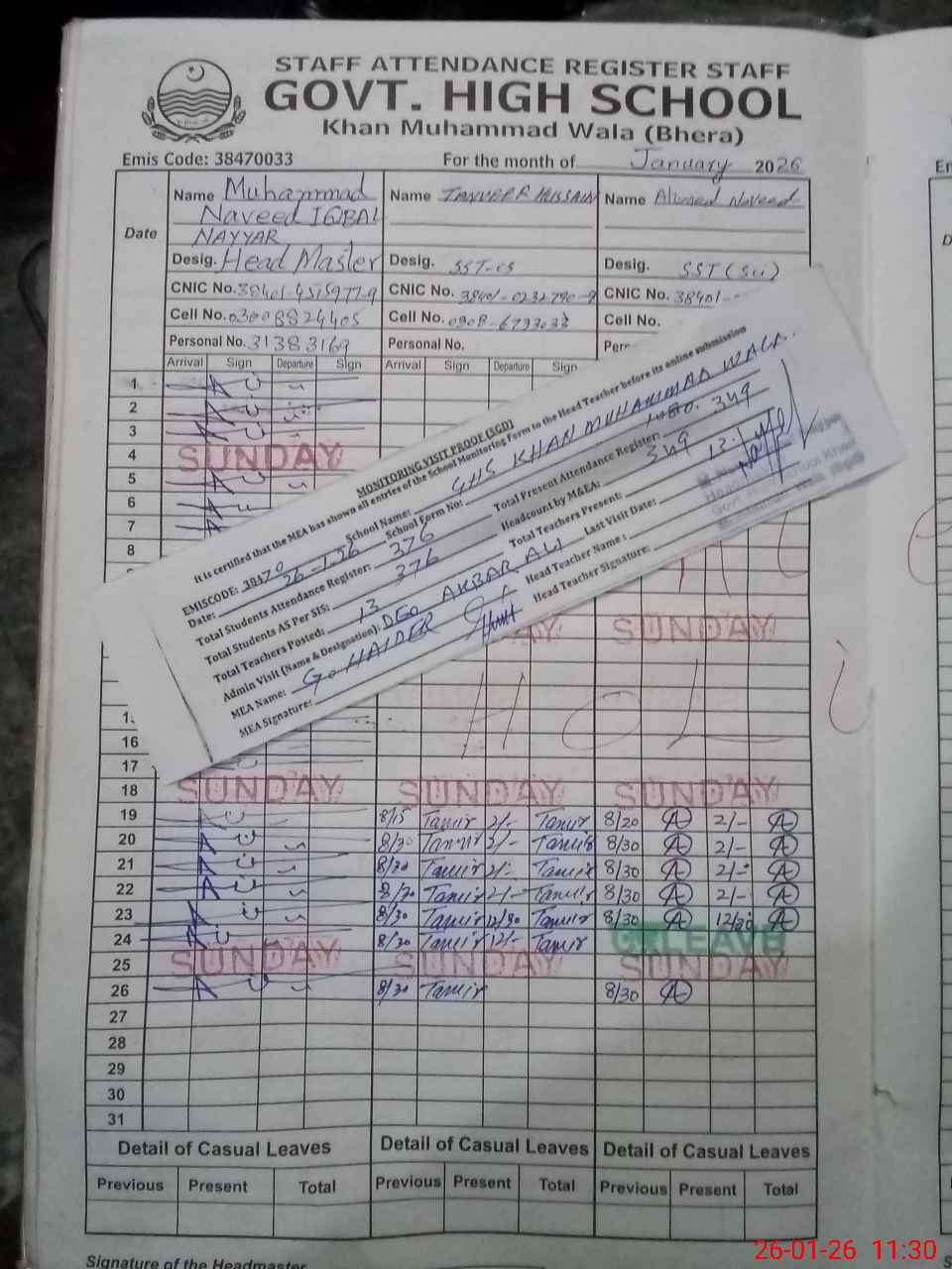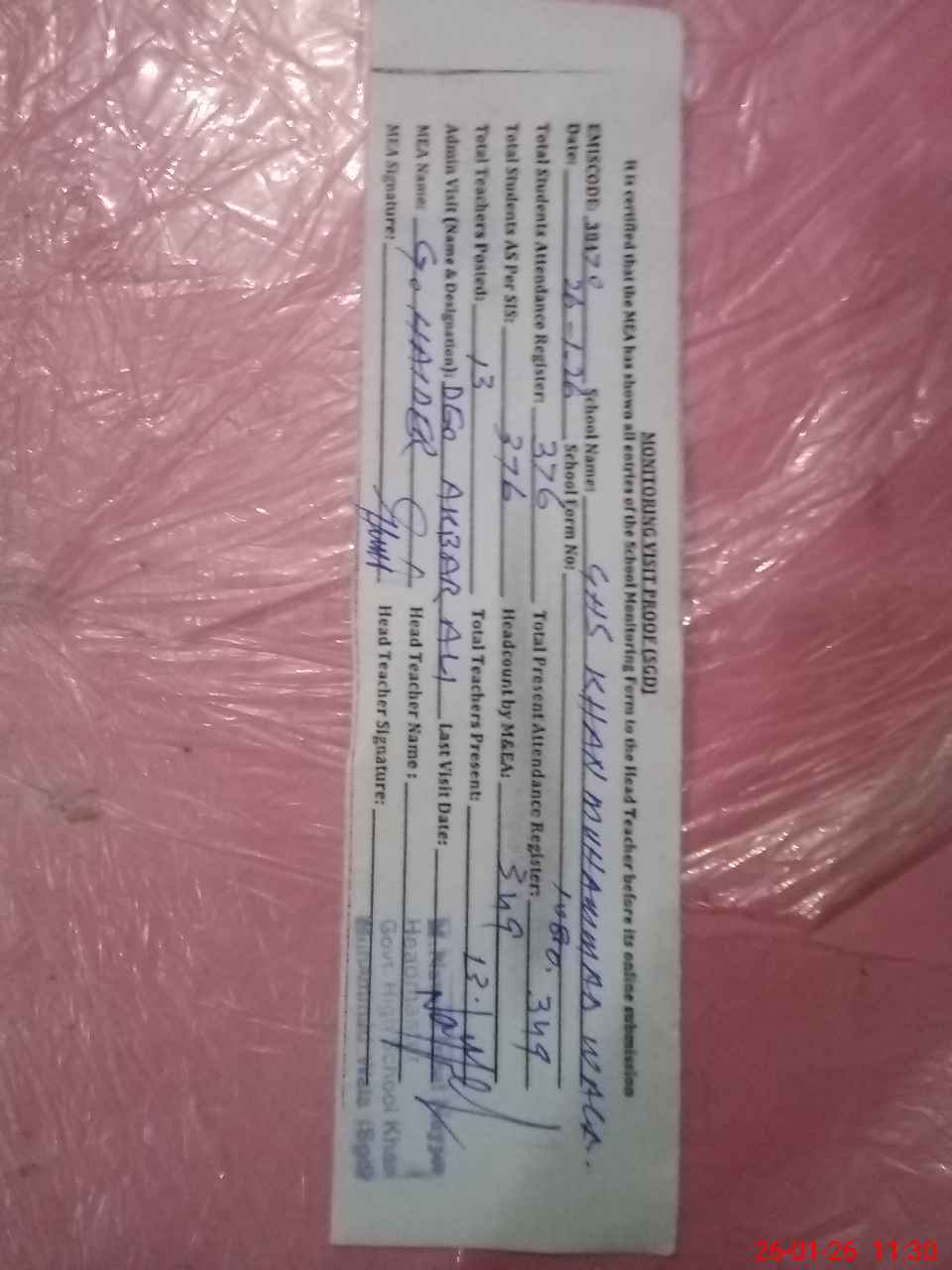 | Attendance Register | Head Teacher | MEA with School | Visit Proof |
