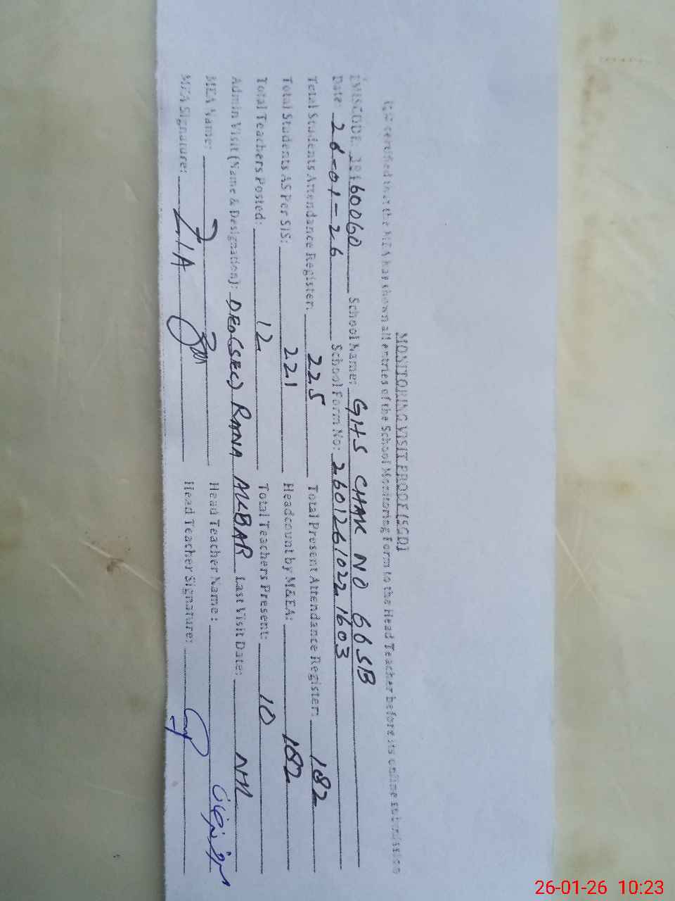 | Certified that this School was Inspected by the Undersigned MEA/DMO Today and the Information Stated Above is as Per Record. | |||||