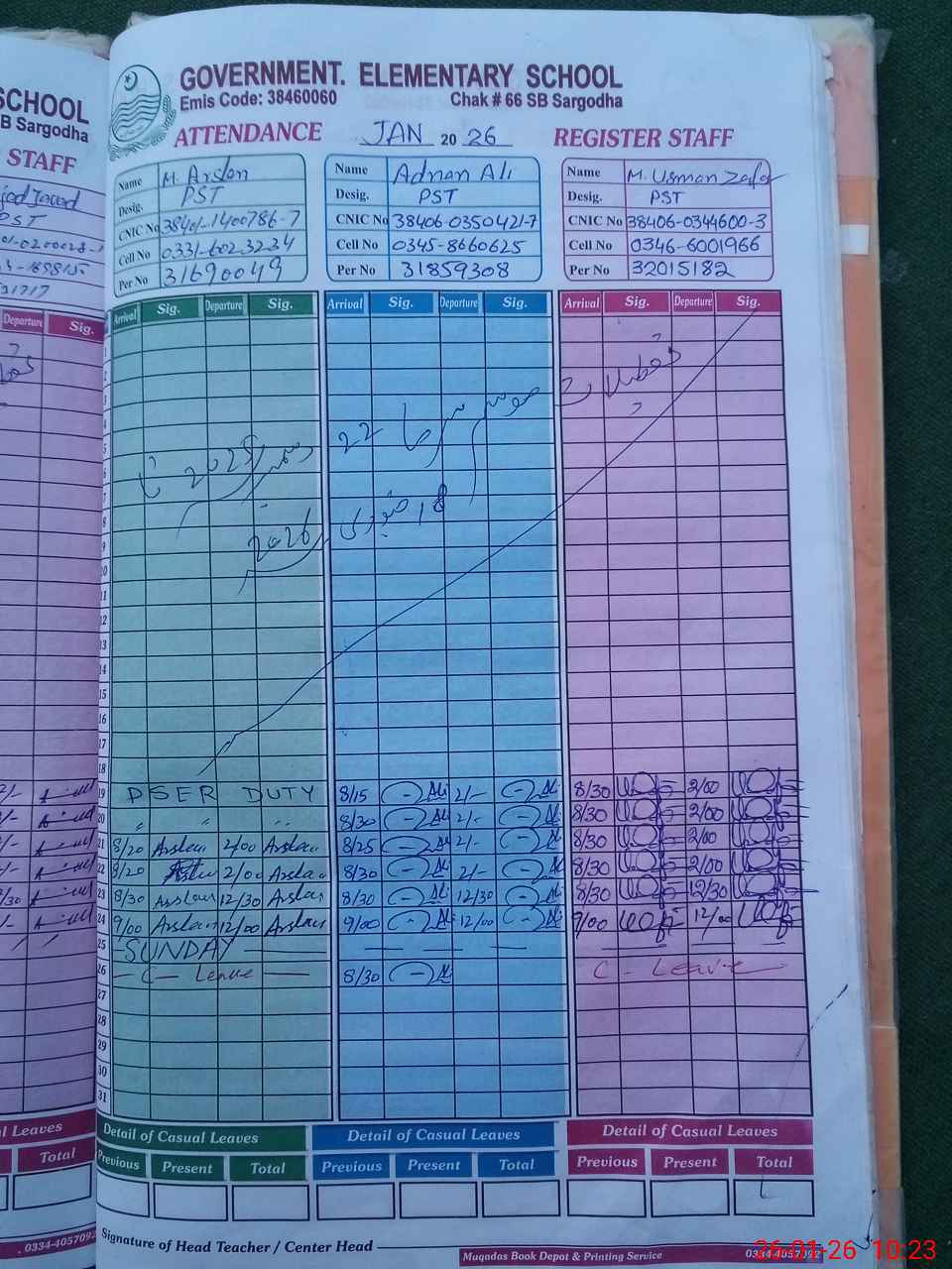 | CNIC | Full Name | Designation | R/C | Absence during last cal. month |
