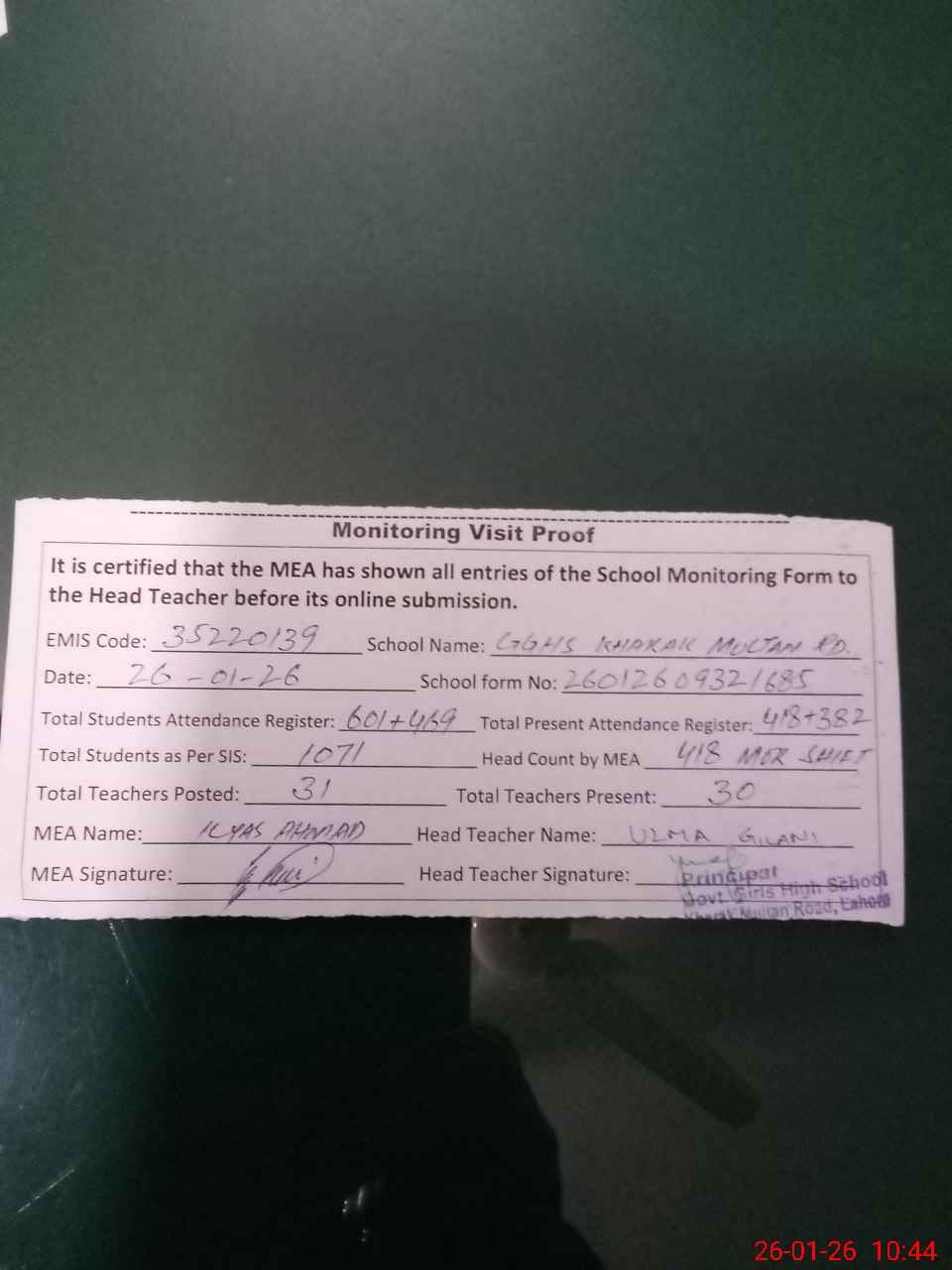 | Attendance Register | Head Teacher | MEA with School | Visit Proof |
