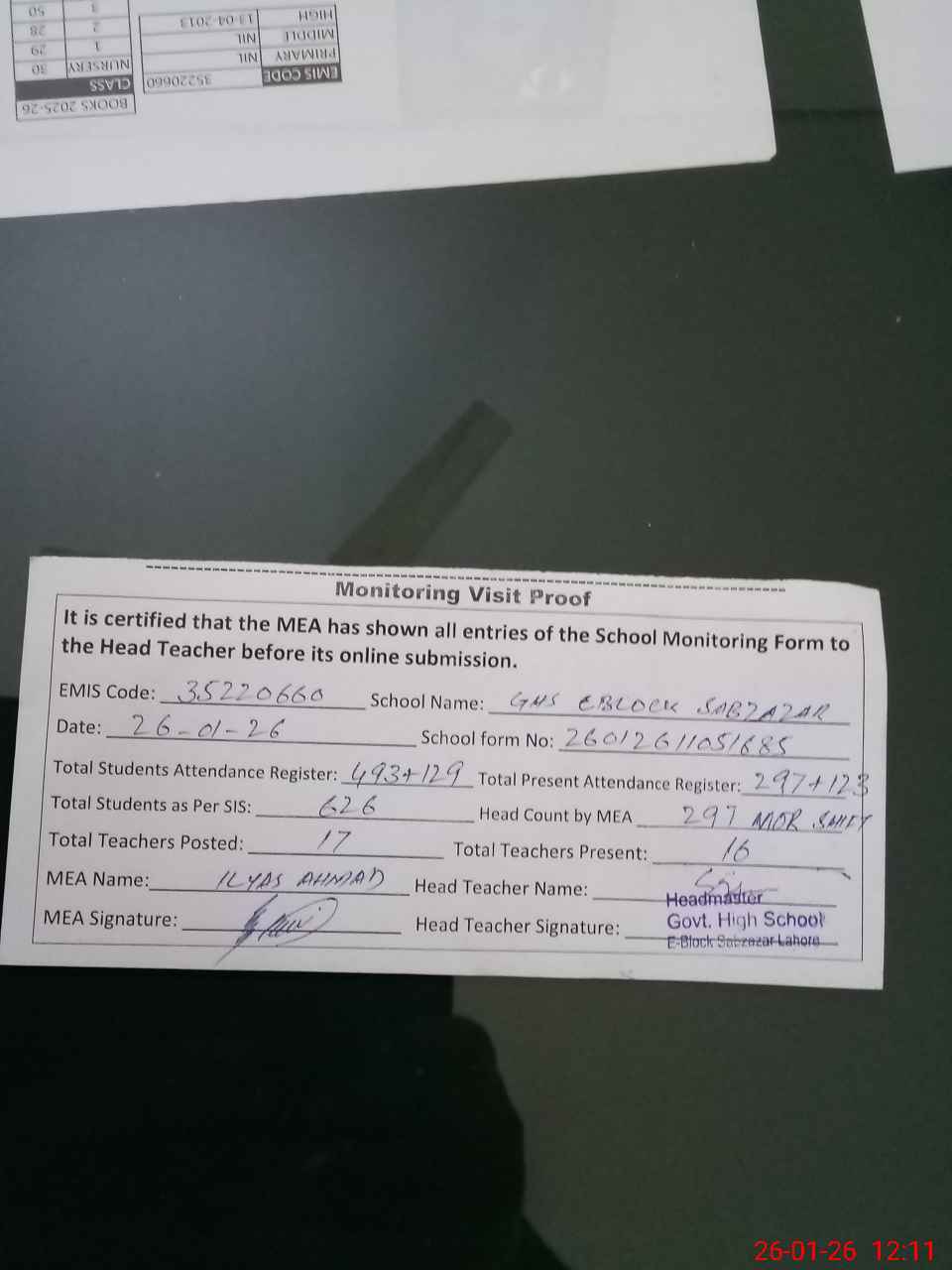 | EMIS Code: 35220660 | Name of School: GHS E-BLOCK SABZAZAR LAHORE | |||