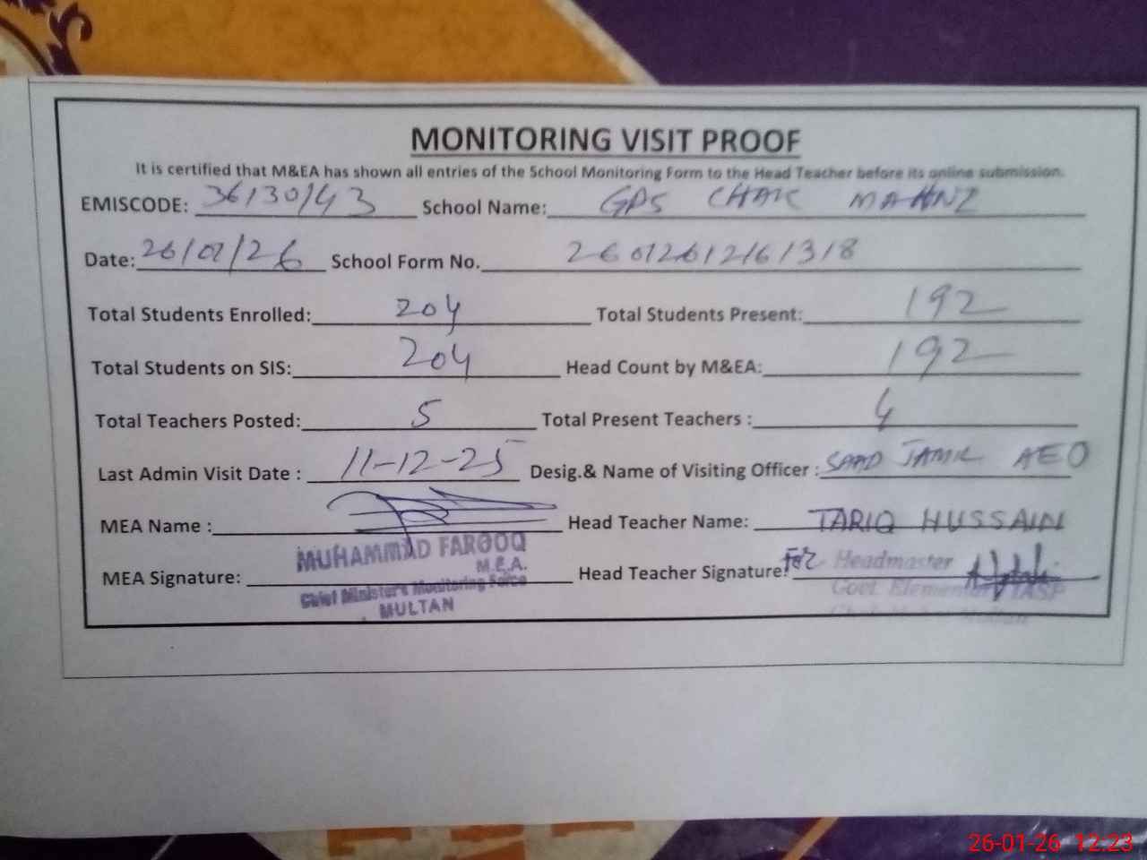 | Attendance Register | Head Teacher | MEA with School | Visit Proof |