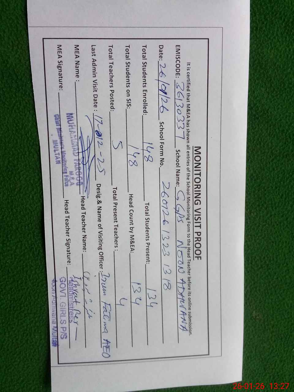 | Attendance Register | Head Teacher | MEA with School | Visit Proof |