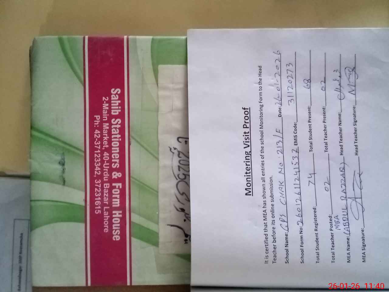 | Attendance Register | Head Teacher | MEA with School | Visit Proof |