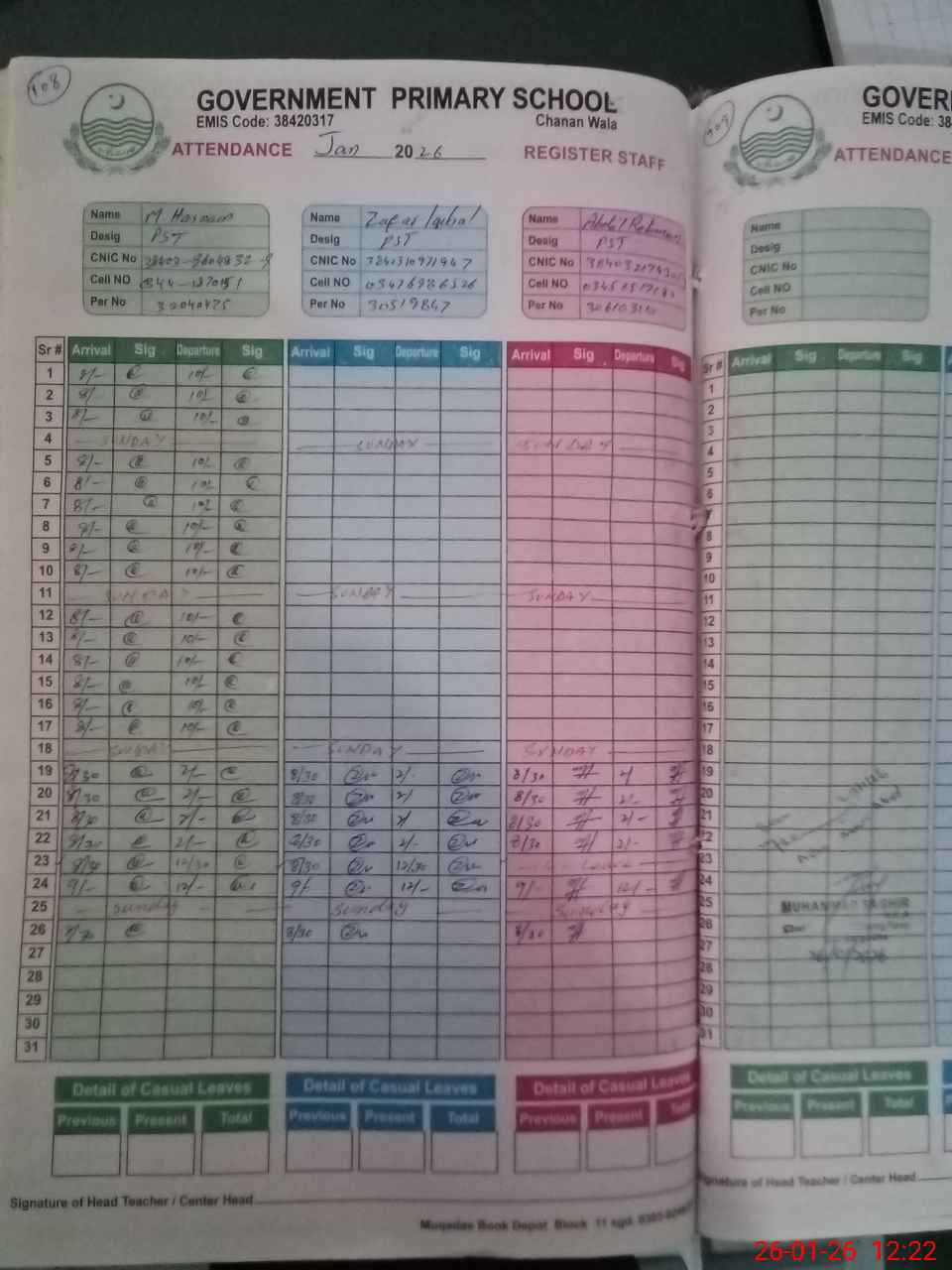 | CNIC | Full Name | Designation | R/C | Absence during last cal. month |