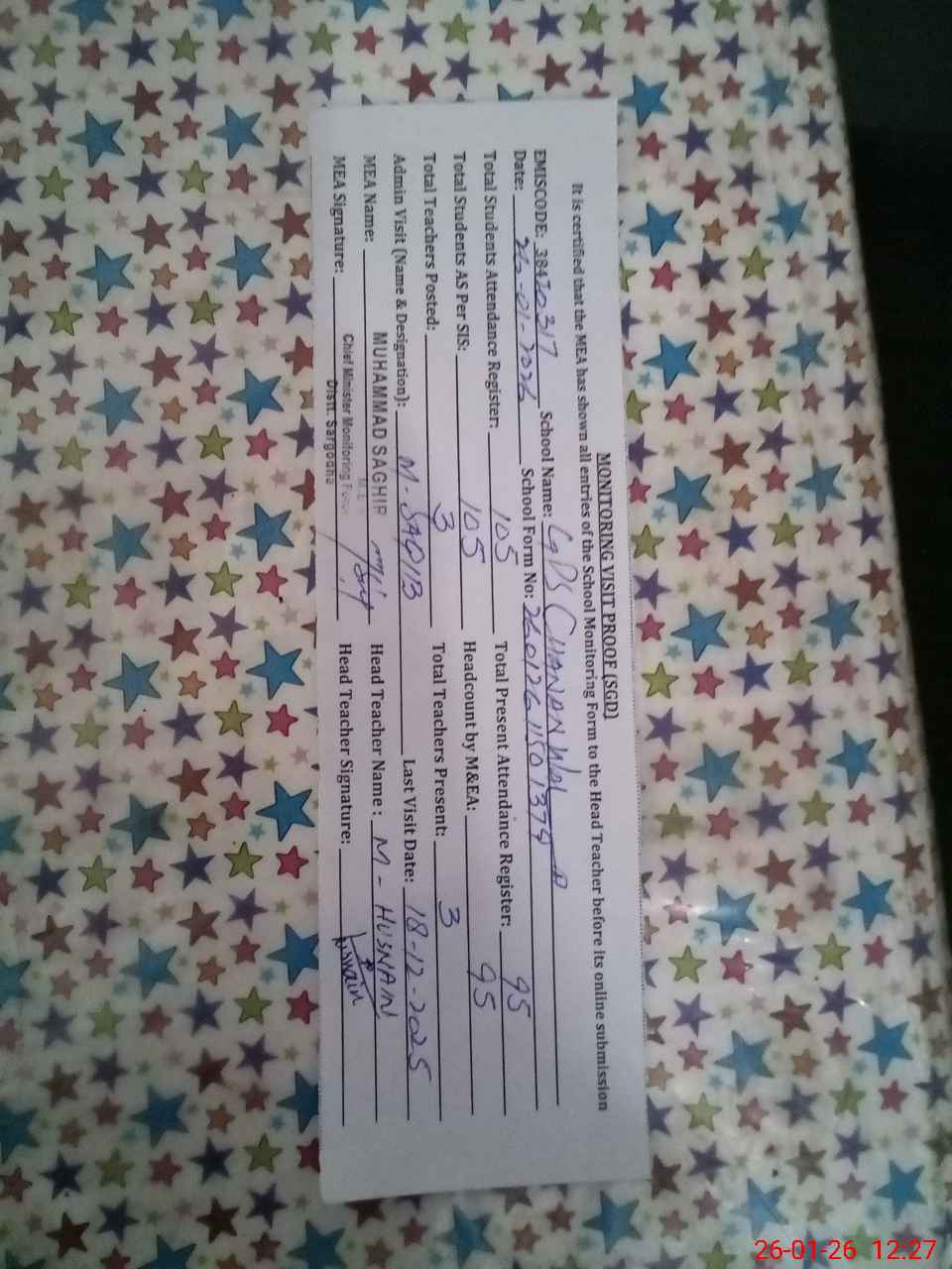 | Attendance Register | Head Teacher | MEA with School | Visit Proof |