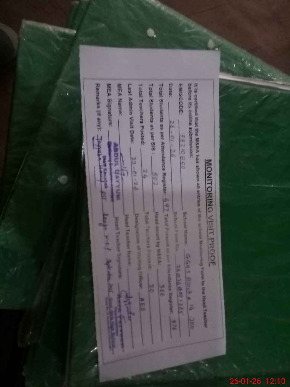 | EMIS Code: 38210850 | Name of School: GGHS BLOCK NO. 14 JAUHAR ABAD | |||