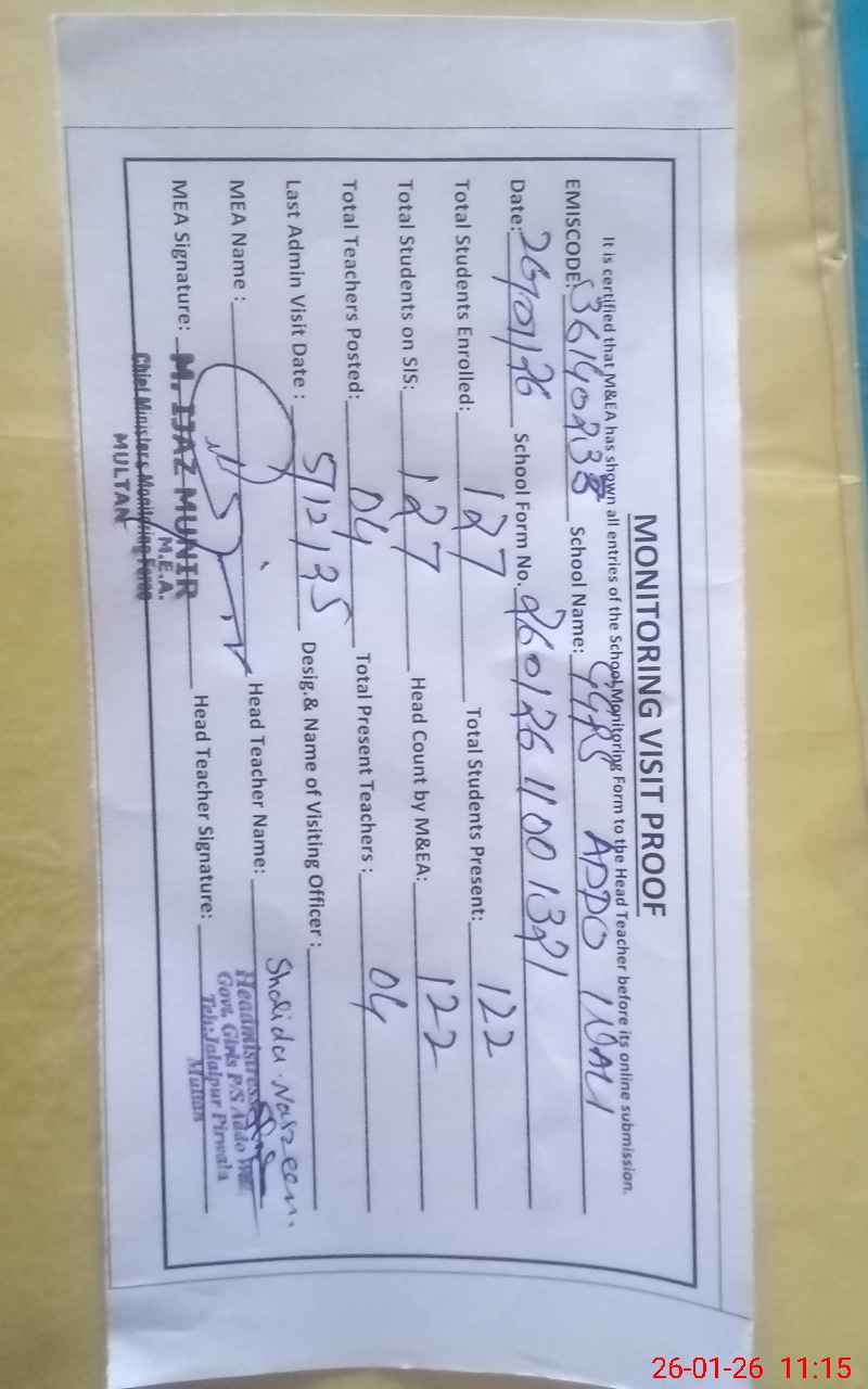| District: MULTAN | Tehsil: JALALPUR PIRWALA | Markaz: ALI PUR SADAT - FEMALE | Level: Primary | |