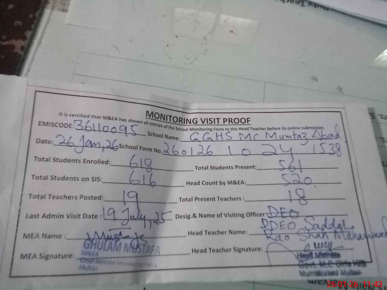 | EMIS Code: 36110095 | Name of School: GGHS MC MUMTAZ ABAD MULTAN | |||