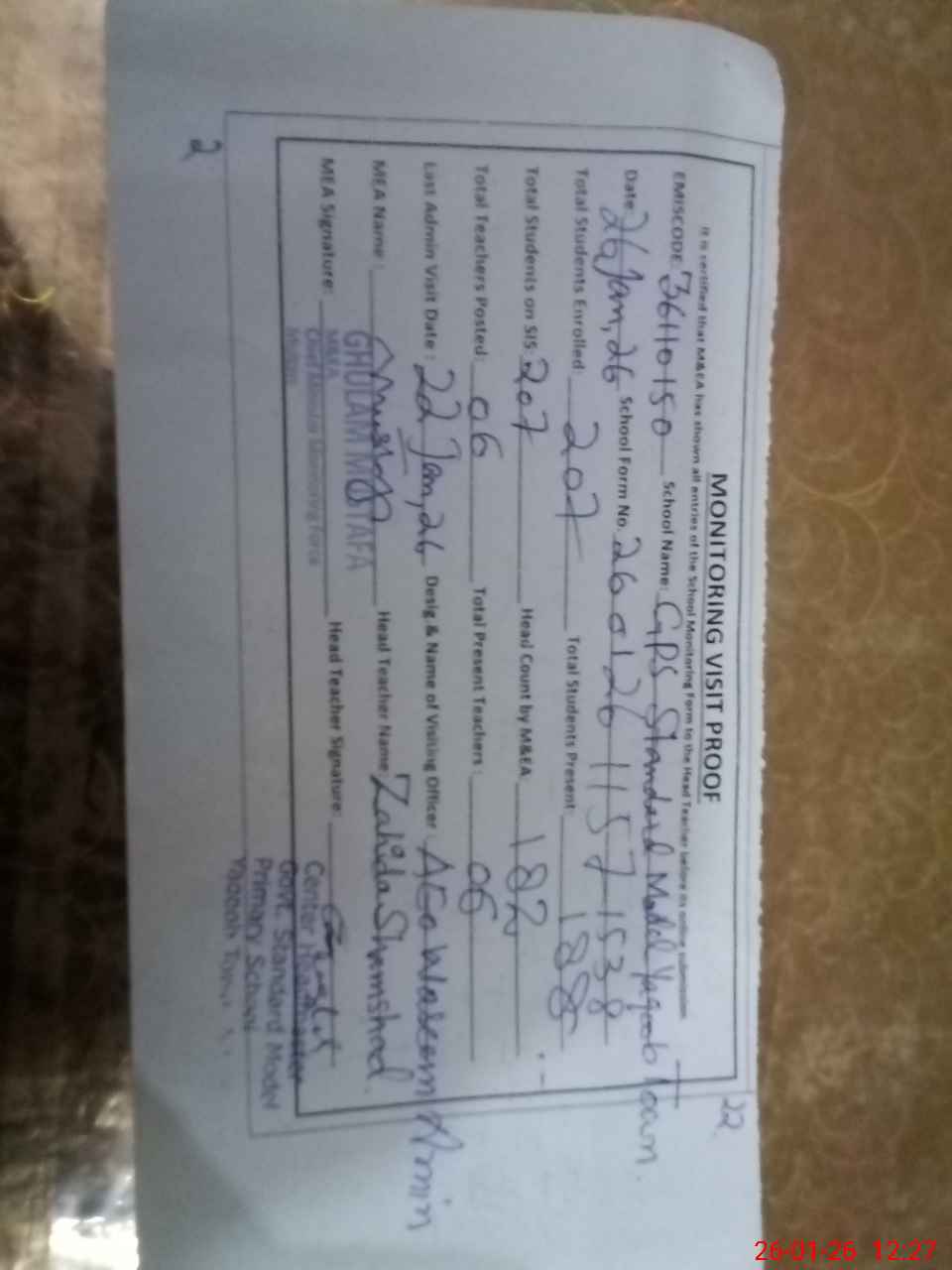 | Attendance Register | Head Teacher | MEA with School | Visit Proof |