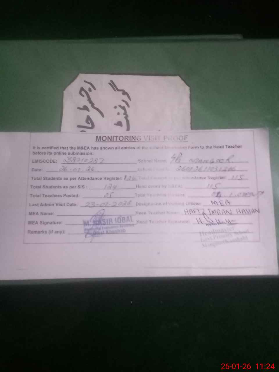 | Attendance Register | Head Teacher | MEA with School | Visit Proof |