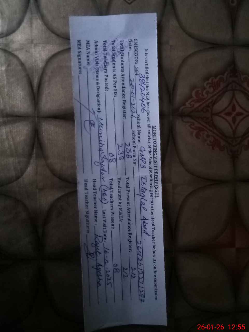 | Attendance Register | Head Teacher | MEA with School | Visit Proof |