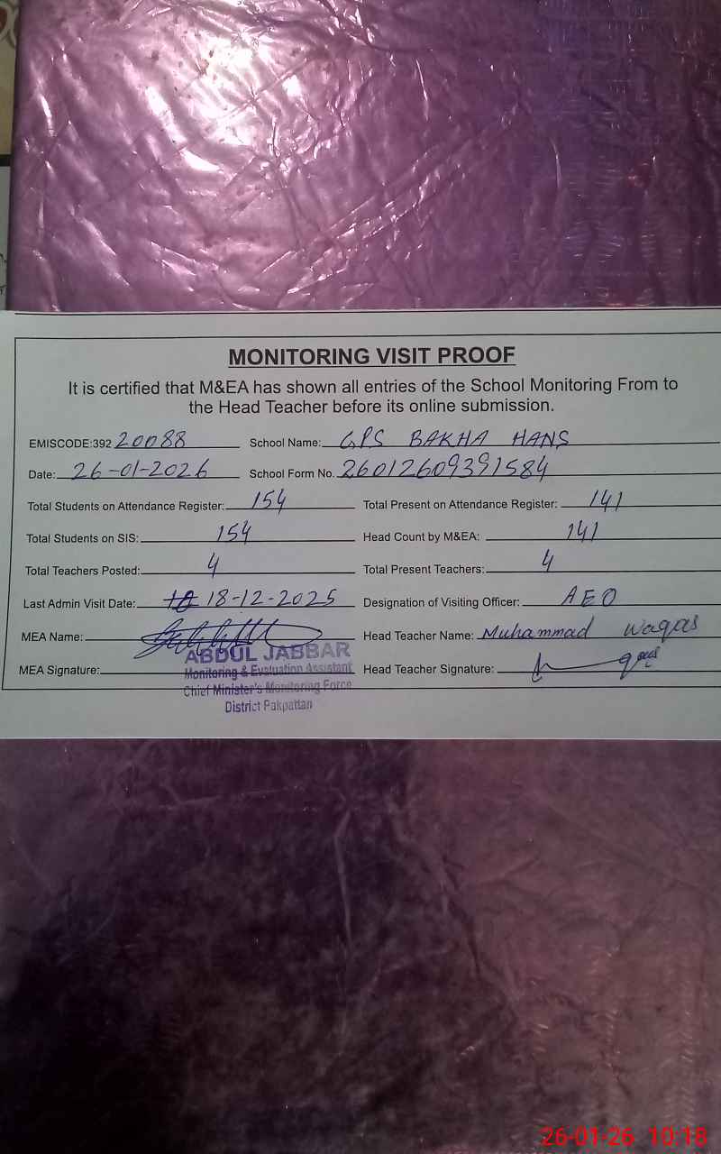 | EMIS Code: 39220088 | Name of School: GPS BAKHA HANS | |||