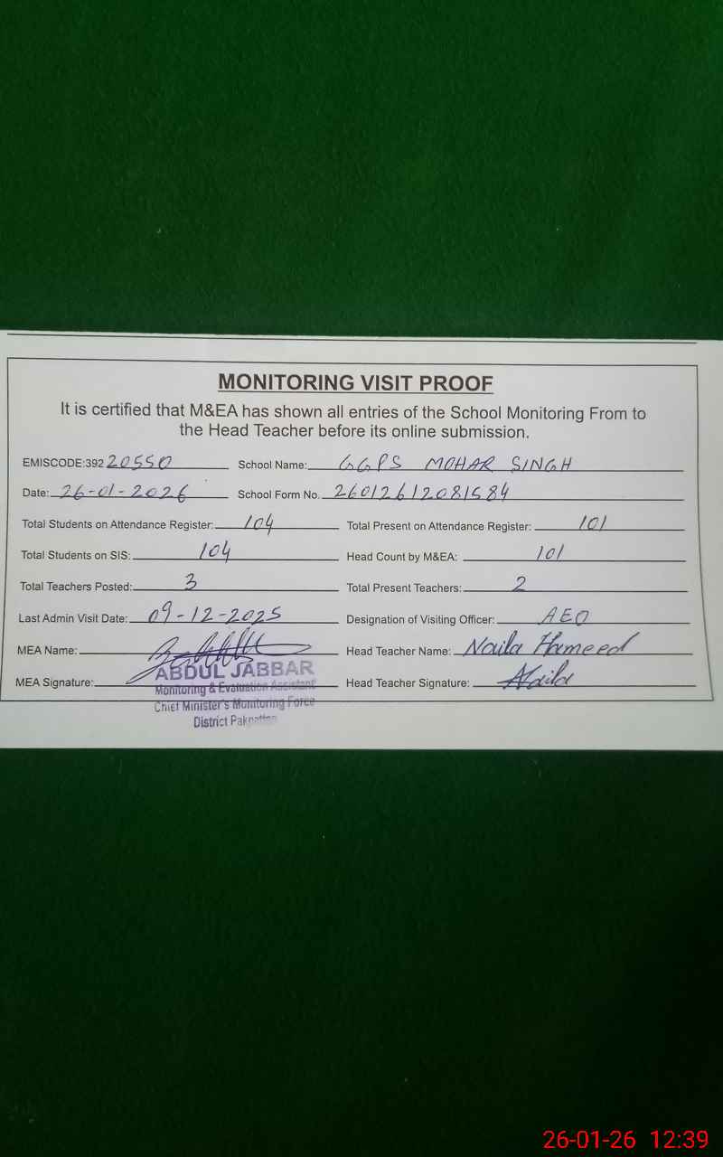 | EMIS Code: 39220550 | Name of School: GGPS MOHAR SINGH | |||
