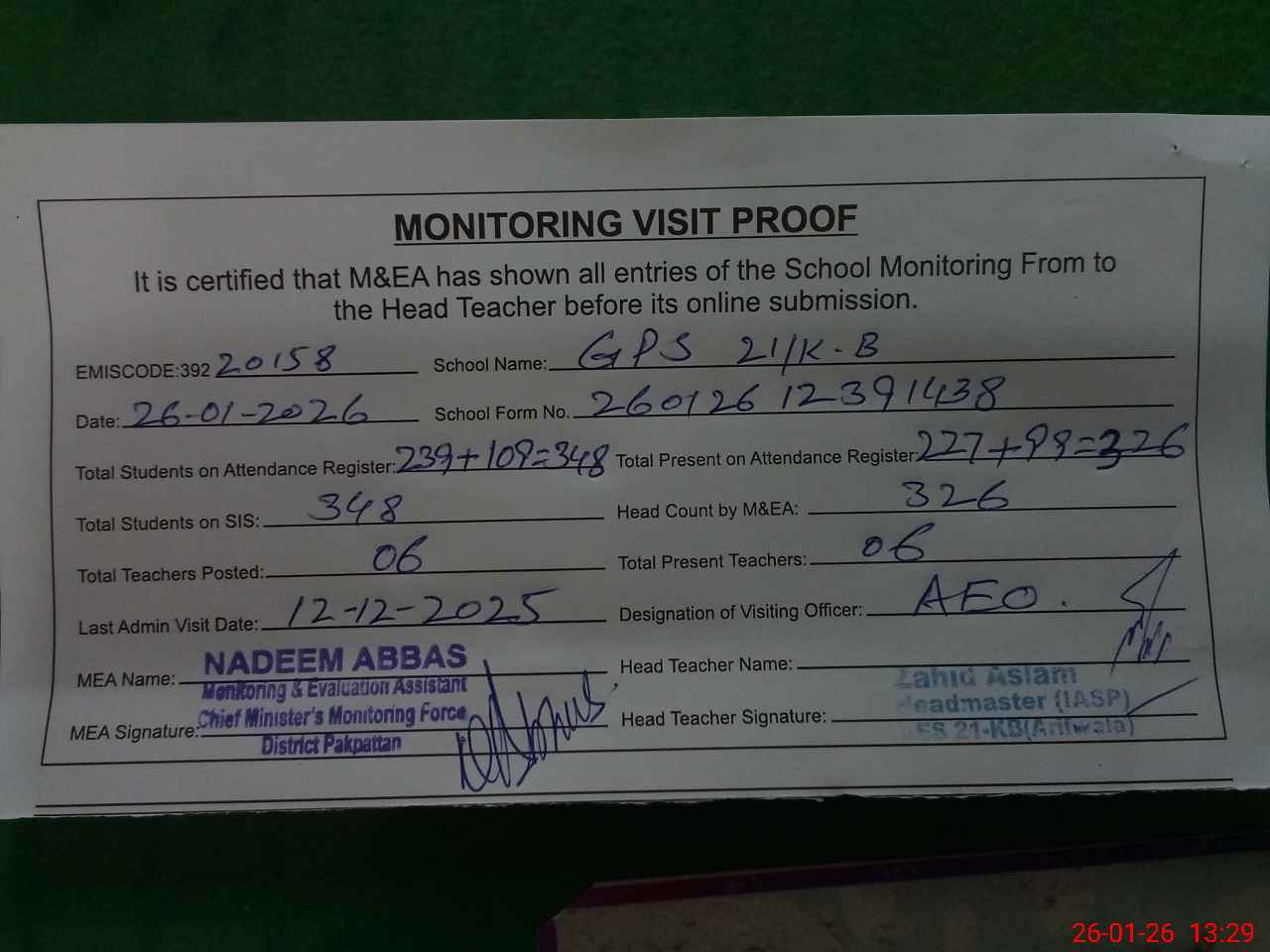 | Attendance Register | Head Teacher | MEA with School | Visit Proof |