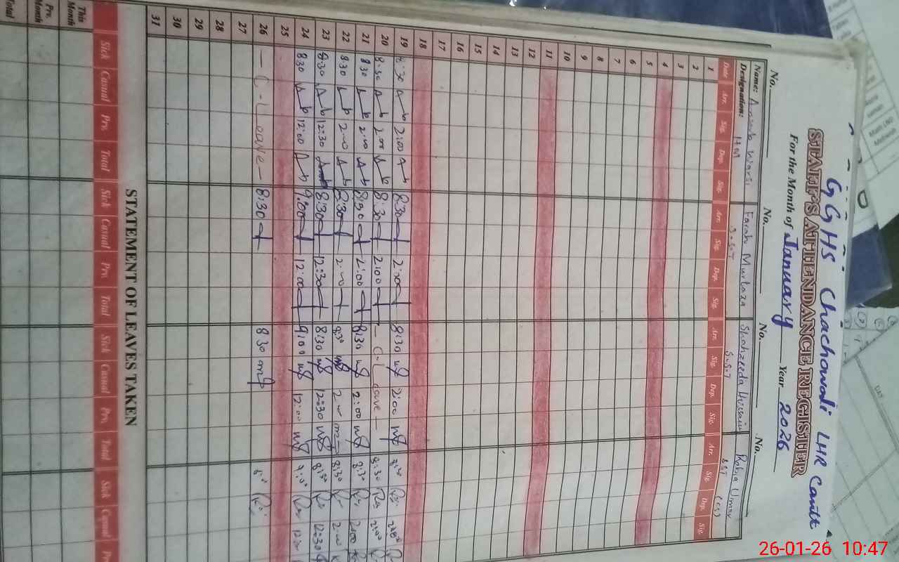 | Remarks (Use Separate Page if Required): 17 students of 10th class are absent from October 2025. 06 students of 9th class are absent from November 2025. 04 wash rooms are nonfunctional due to locked | |||||