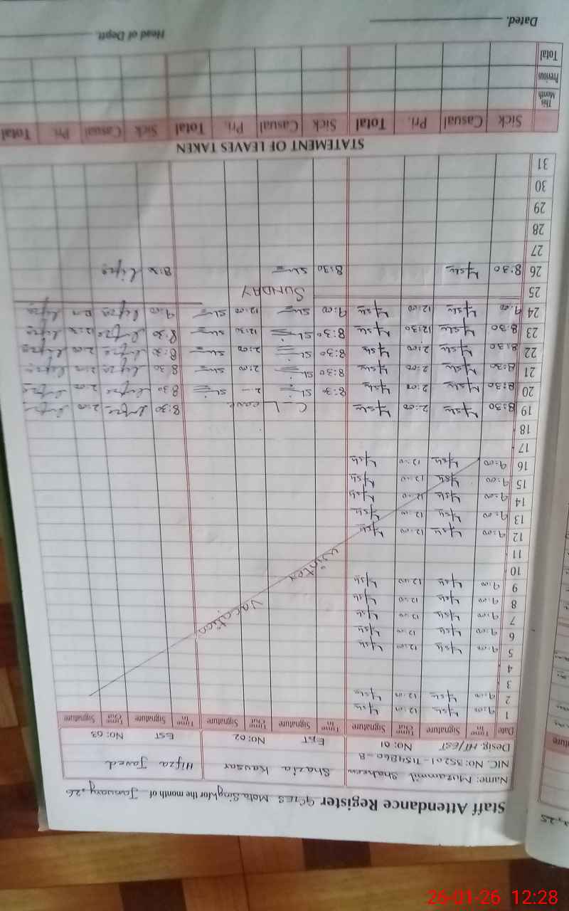 | CNIC | Full Name | Designation | R/C | Absence During Last Calender Month |
