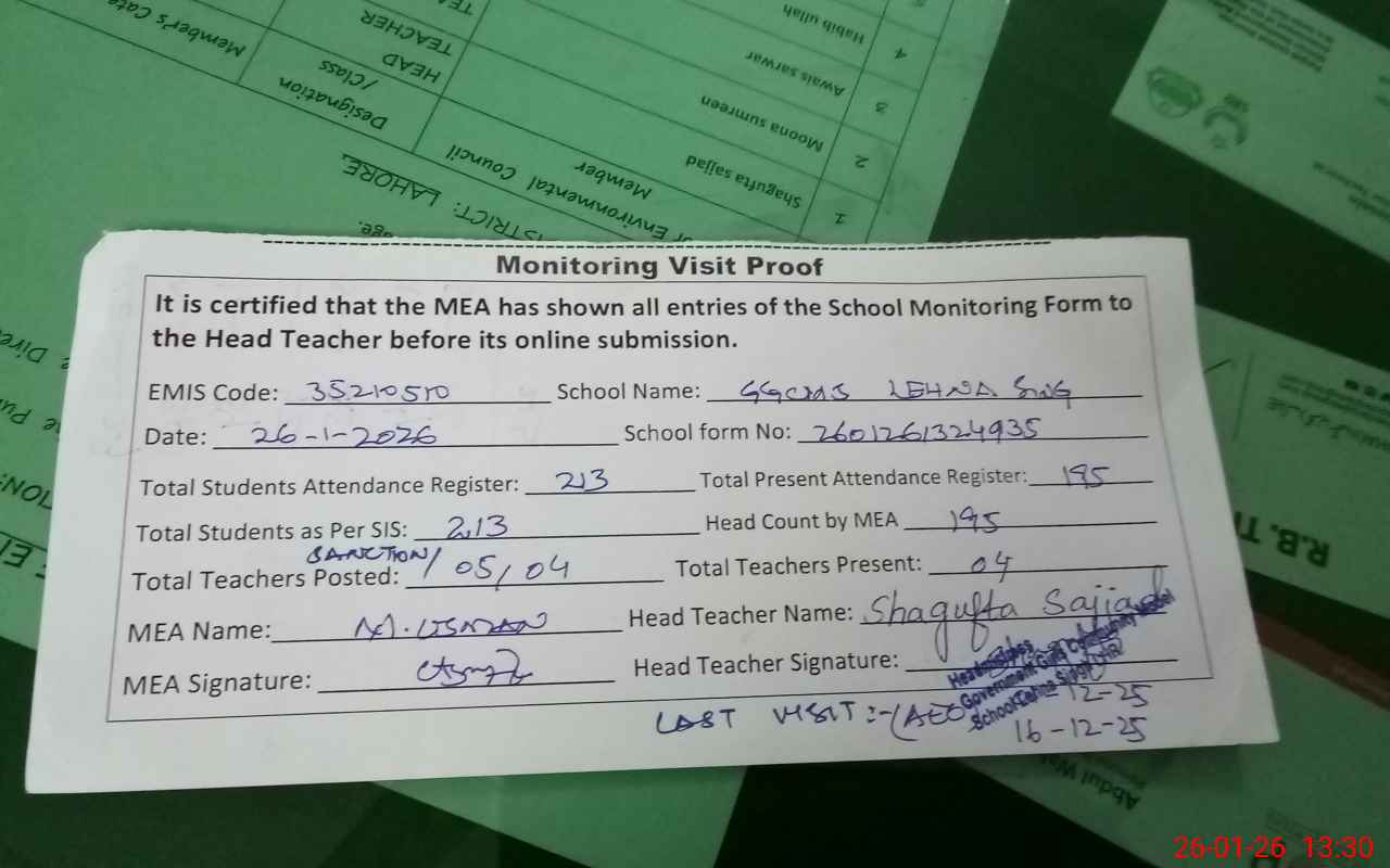 | Attendance Register | Head Teacher | MEA with School | Visit Proof |