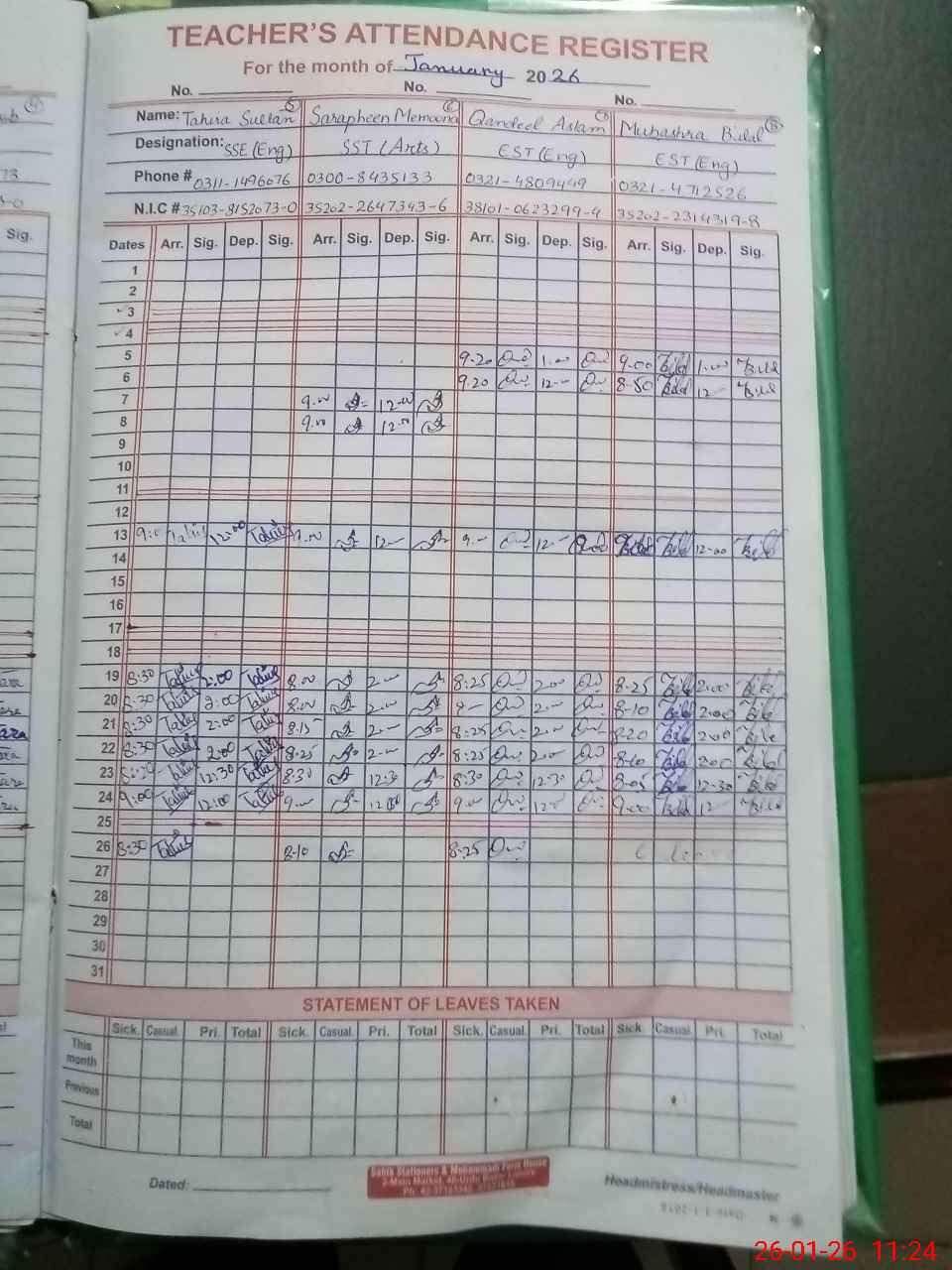 | Remarks (Use Separate Page if Required): Hina Asghar PST Absent wef 01 September 2025 to till date Allah Rakha Mali attendance column blank wef 01 September 2025 to till date Physically not available so mark absent last visit DEO on 15 September 2025 | |||||
