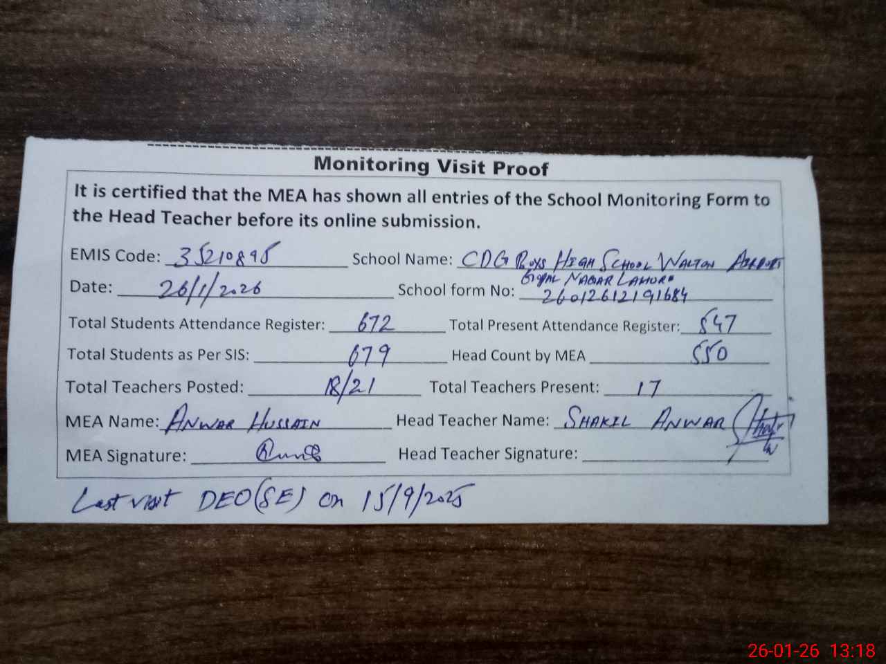 | Certified that this School was Inspected by the Undersigned MEA/DMO Today and the Information Stated Above is as Per Record. | |||||