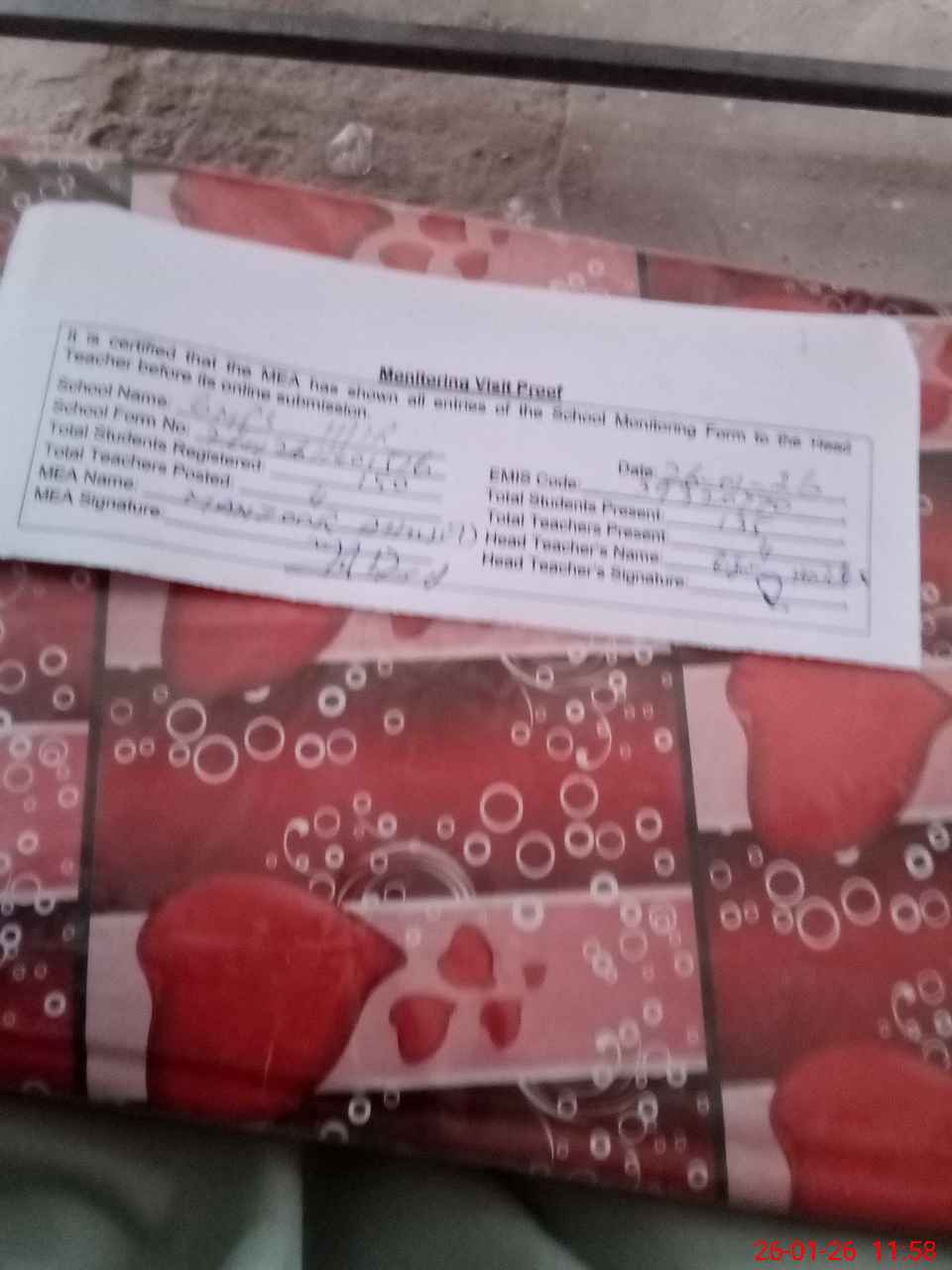 | Attendance Register | Head Teacher | MEA with School | Visit Proof |